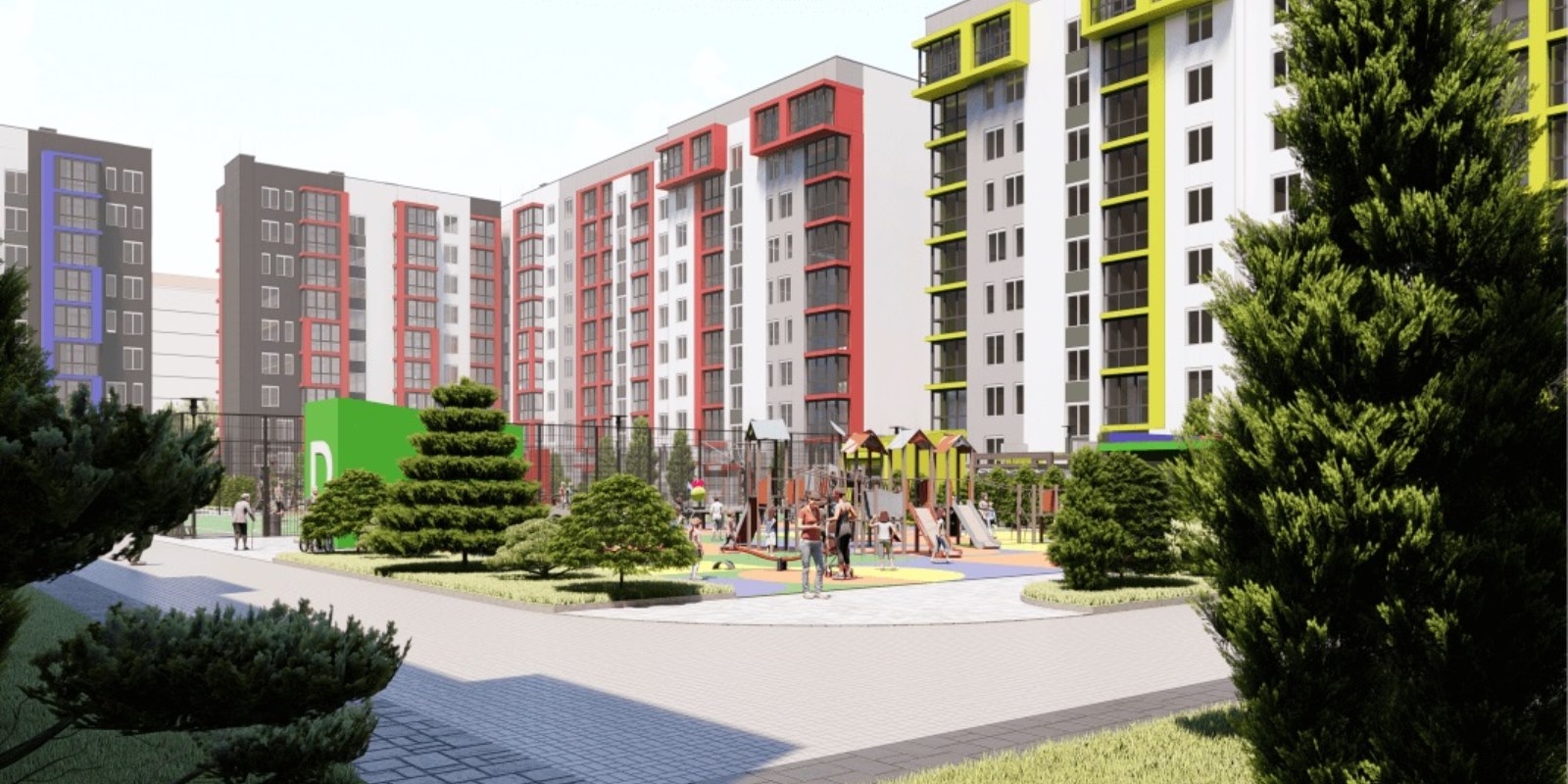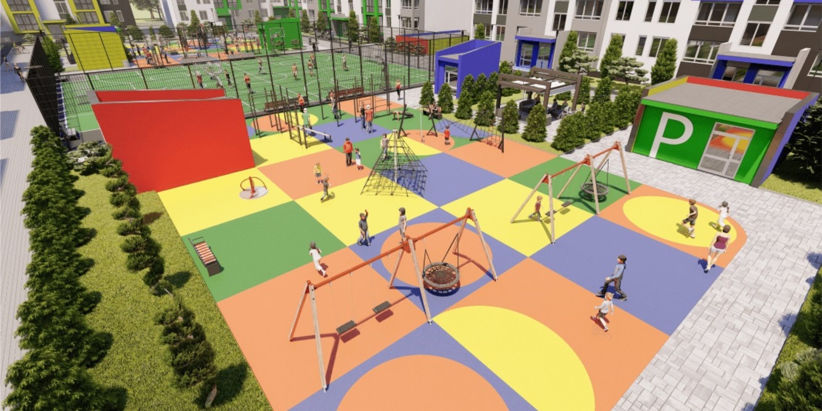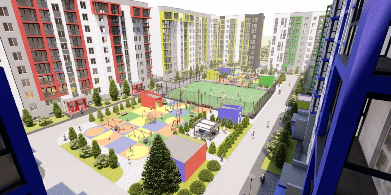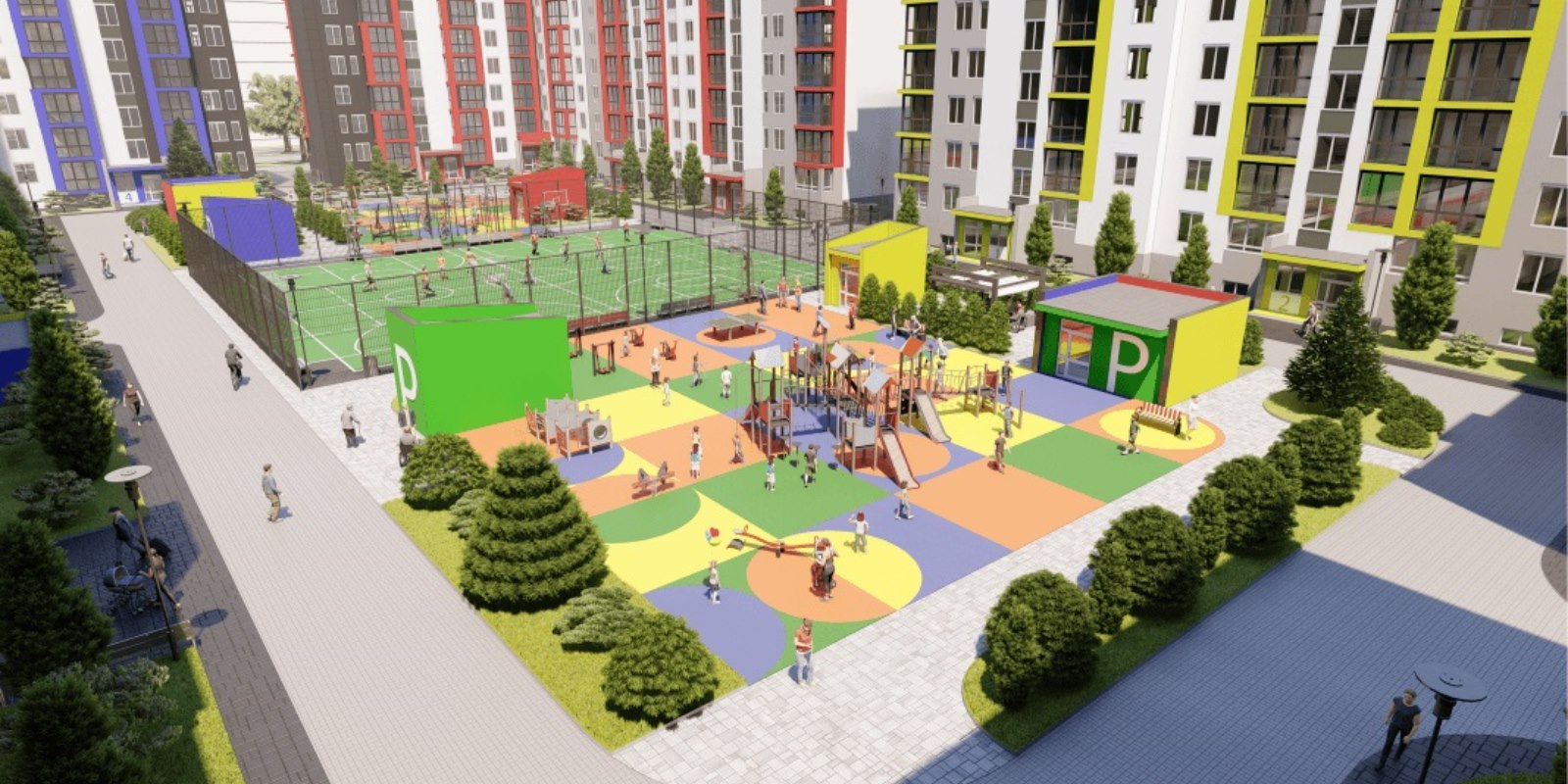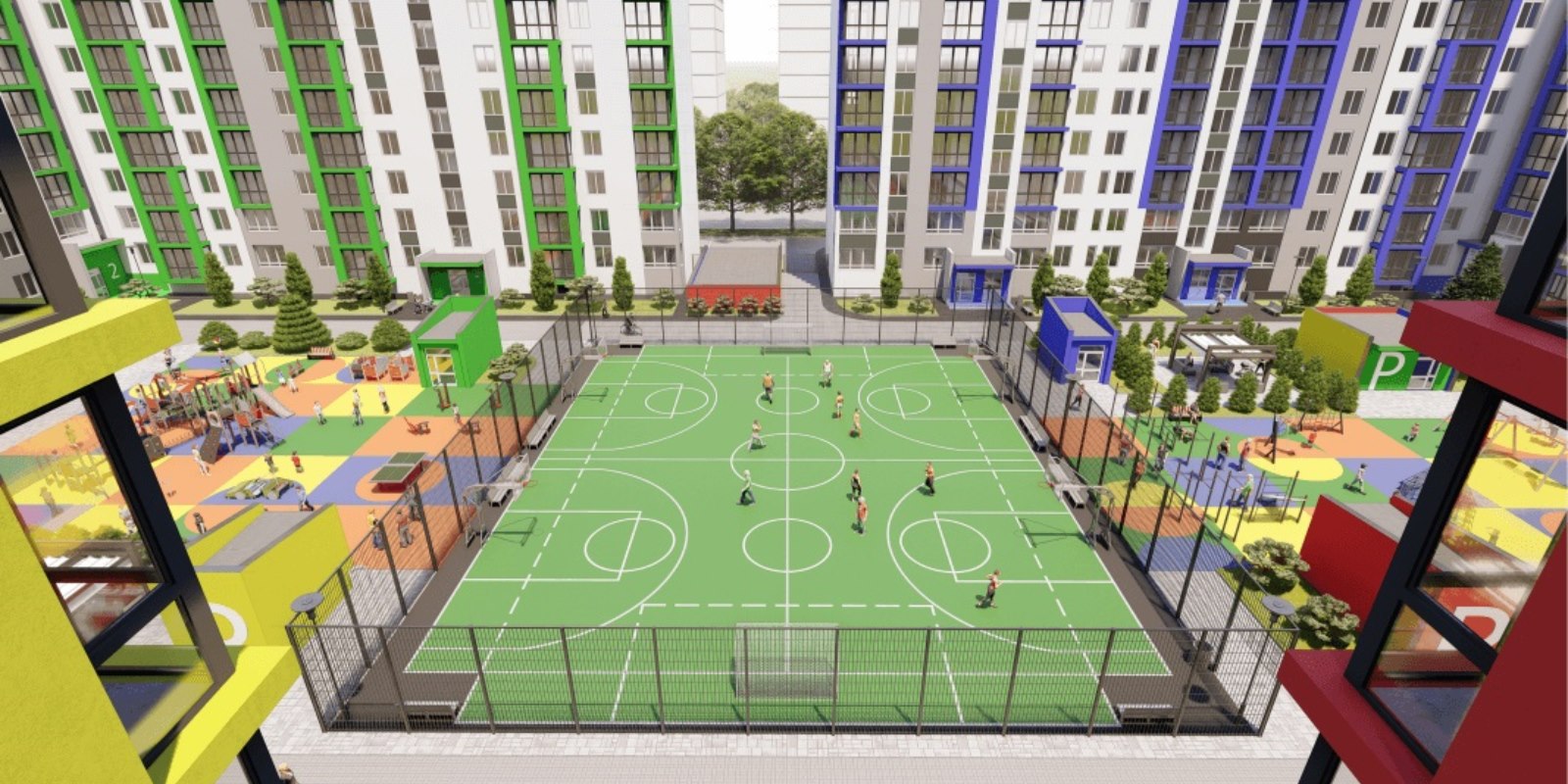 Отдельное внимание стоит уделить внутреннему устройству двора: большое футбольное поле, окруженное развивающими детскими и WORK OUT площадками с зонами отдыха.