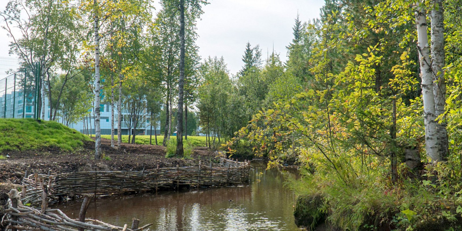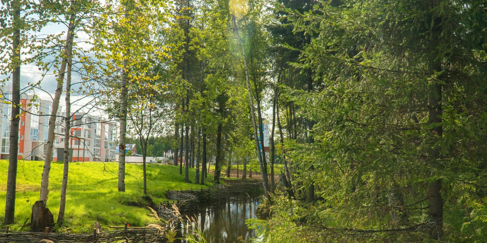 Рядом с ЖК "Дорожный" имеется лесная посадка и речка. Данный ландшафт отлично подойдет для семейный прогулок, бега и выгула домашних питомцев.