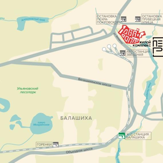ЖК "Пехра" расположен в г. Балашиха между ул. Заречная, Звездная и Трубецкая. С запада комплекс ограничивается Щелковским шоссе