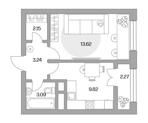1Комната34.12 M²Общая площадь9.82 M²площадь кухникухня2этаж