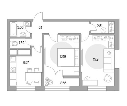 | 1-комн. | 32.7 – 39.5 | 6.81 – 9.13 млн |