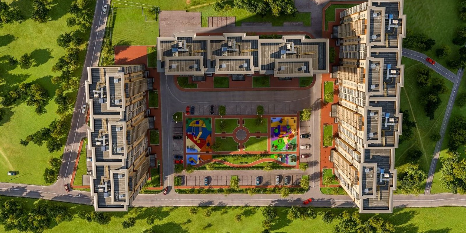 Все дома ЖК расположены таким образом, что образуют просторный внутренний двор. На прилегающей территории размещены гостевые автостоянки, зоны для отдыха и детские игровые площадки. Застройщиком проведены основные работы по озеленению двора и его благоустройству.