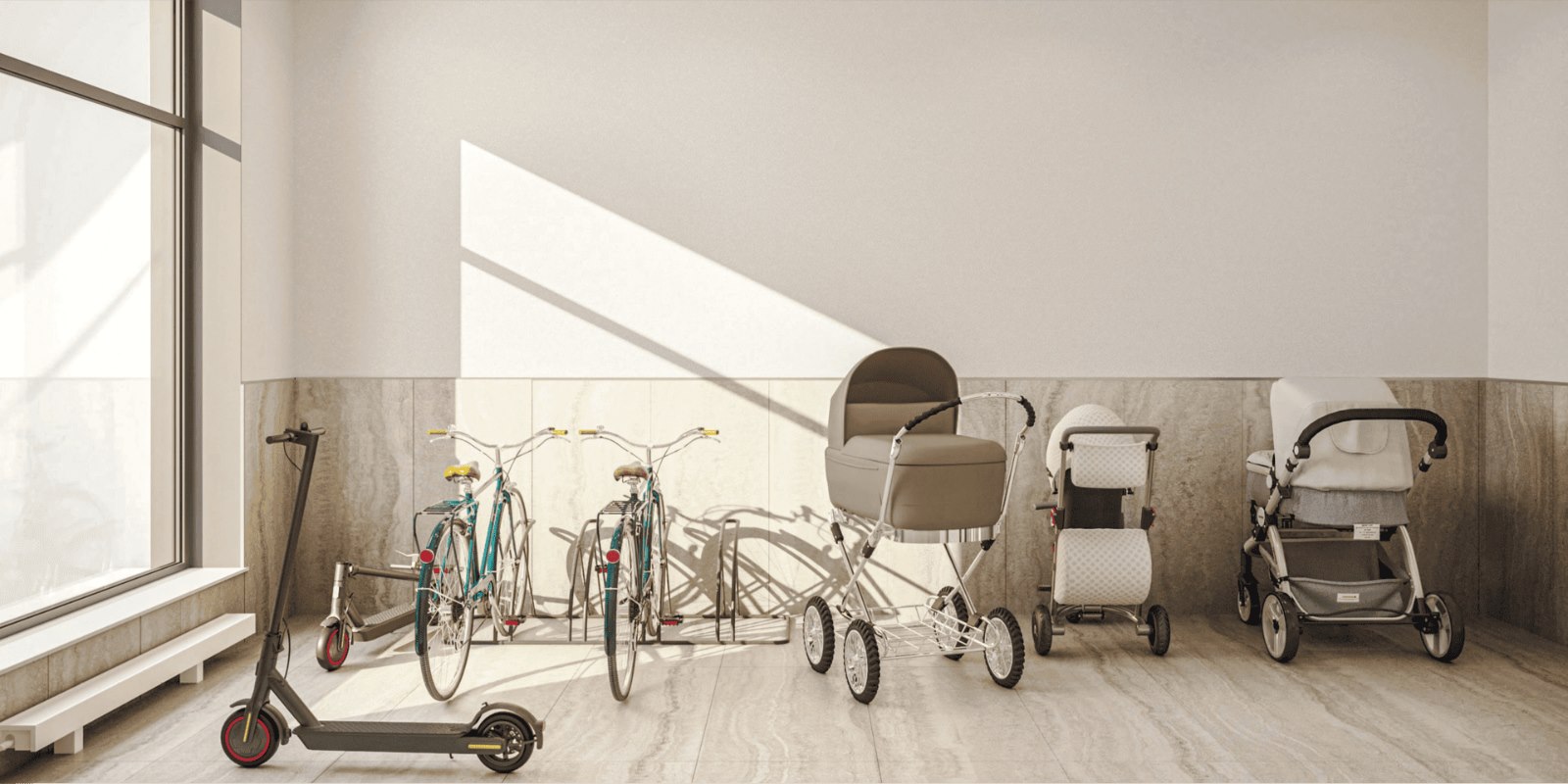 Специально для родителей с колясками, детей на велосипедах и самокатах, маломобильных жителей предусмотрена безбарьерная среда. Заходить в подъезды домов легко — никаких ступеней и порогов. Весь «транспорт» можно оставить в специальных комнатах для хранения на первом этаже и не нести домой.