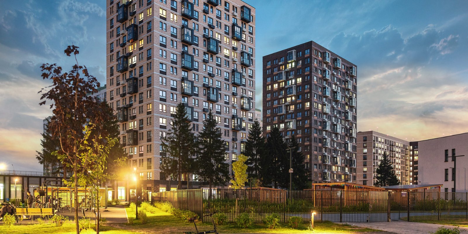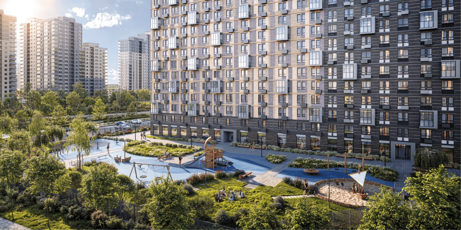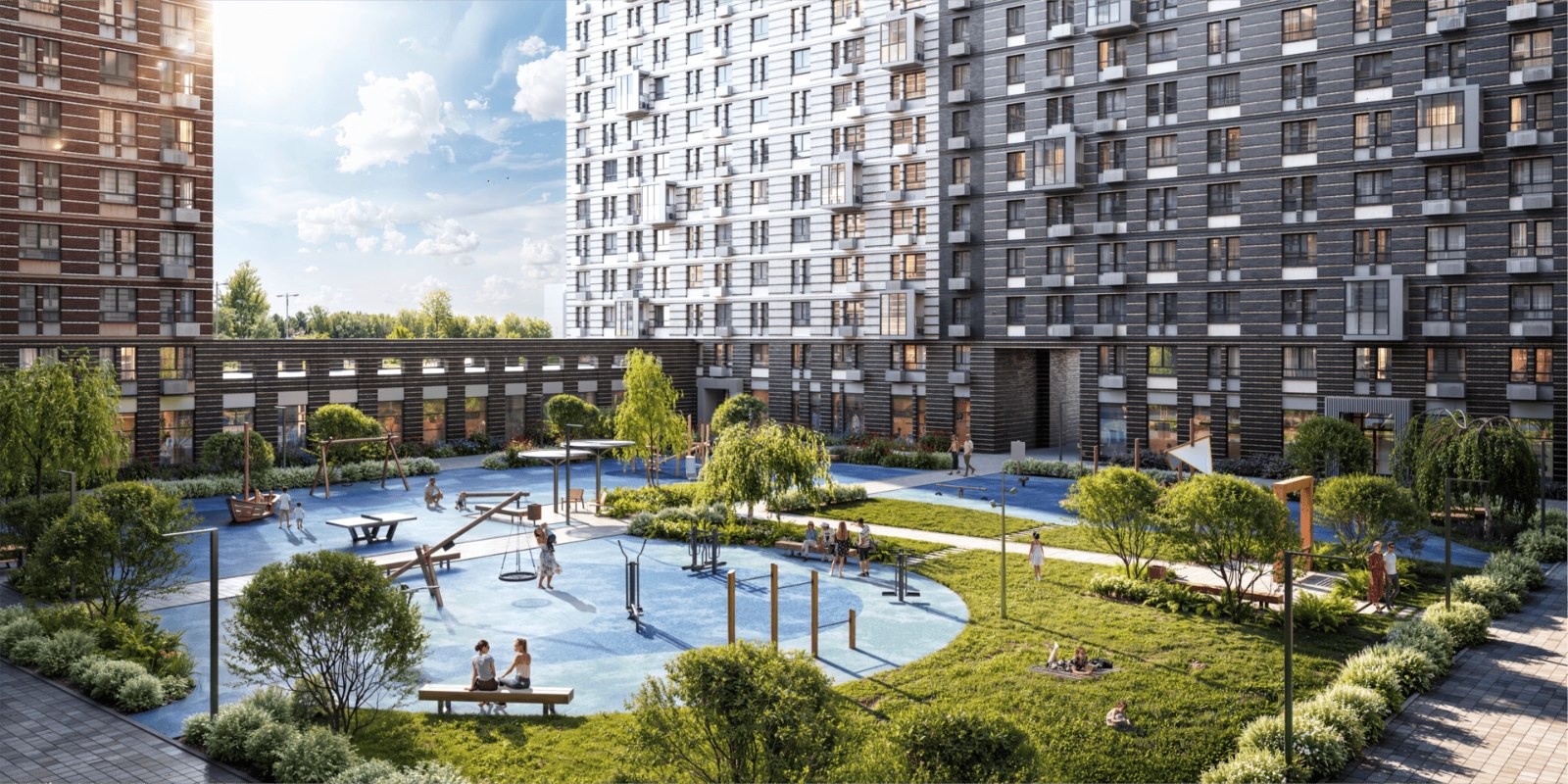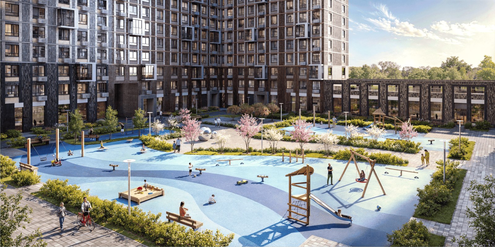Двор закрыт от машин и посторонних — доступ есть только для спецтехники. Одна из точек притяжения — арт-объект площадью 500 м² — березовая роща с атмосферным вечерним освещением. Гуляйте по аллеям, читайте в беседках, катайтесь на велосипедах — меняйте увлечения хоть каждый день. Для детей здесь есть безопасные спортивные и игровые площадки.
