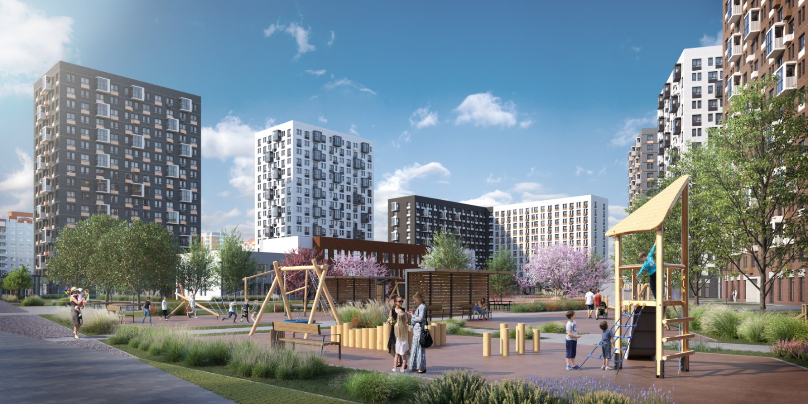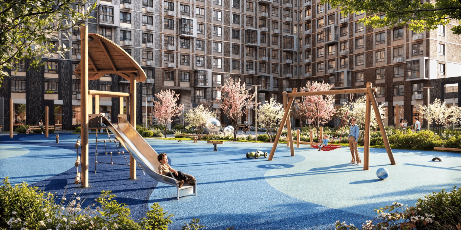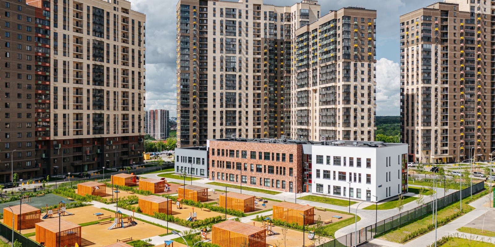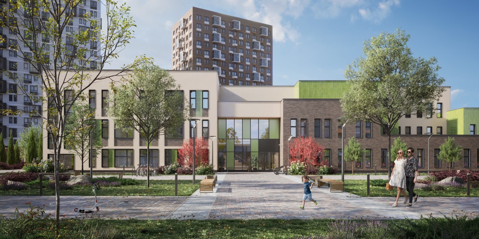 А по утрам можно поспать подольше и прийти на 10 минут раньше в школу или один из 3 детских садов, потому что они прямо на территории комплекса и уже открыты. Всего на территории комплекса планируется открыть 10 детских садов и 4 школы.
