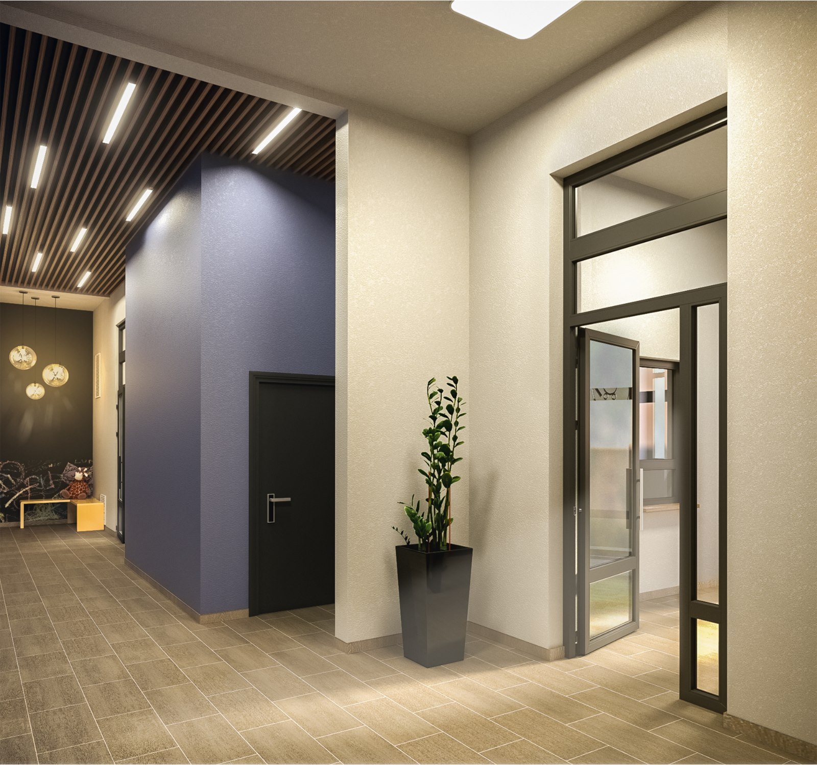 Больше естественного света и пространства будет в лобби — здесь панорамные окна. Это еще и безопасно: вы всегда видите, что происходит снаружи и во дворе. В лобби появятся мягкие диваны, фигурные панно, живые растения и настенные арт-объекты — пусть дом и уют начинаются здесь.