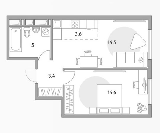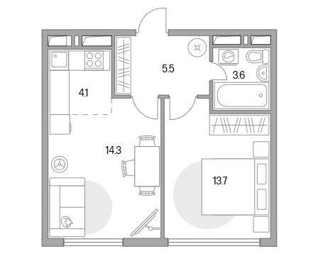 2Комнаты41.1 M²Общая площадь3.6 M²площадь кухникухня19этаж