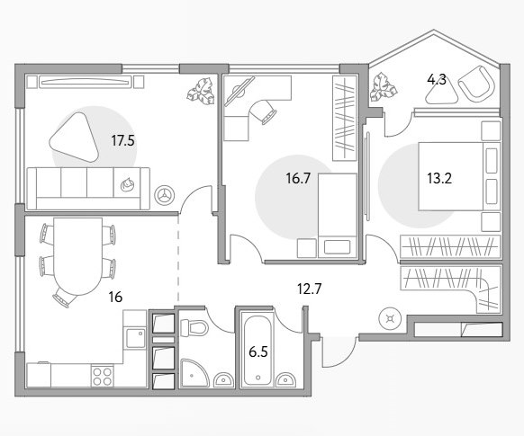3Комнаты86.9 M²Общая площадь16 M²площадь кухникухня4этаж