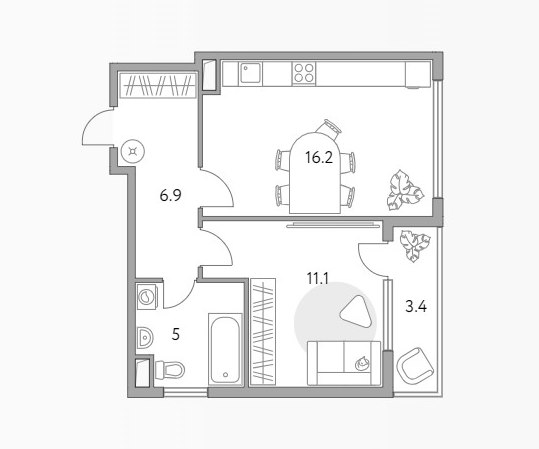 1Комната42.6 M²Общая площадь16.2 M²площадь кухникухня2этаж