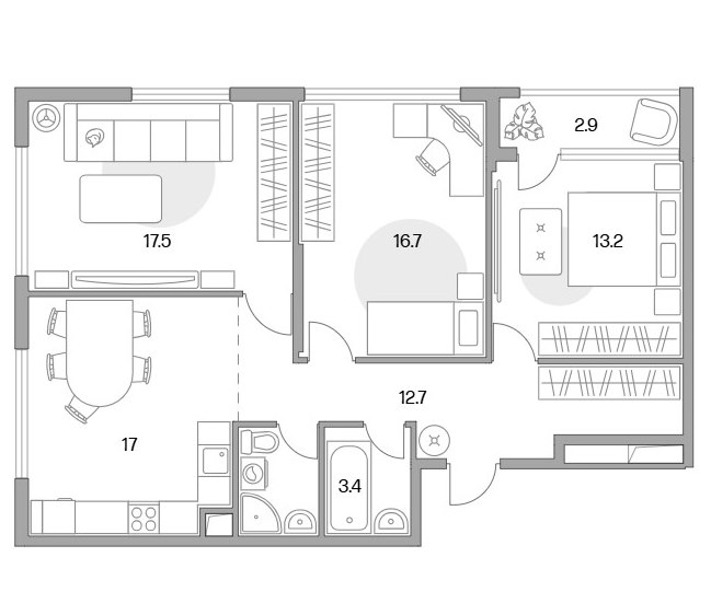 3Комнаты86.5 M²Общая площадь17 M²площадь кухникухня2этаж