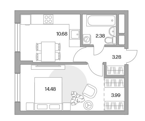 1Комната34.48 M²Общая площадь10.68 M²площадь кухникухня3этаж