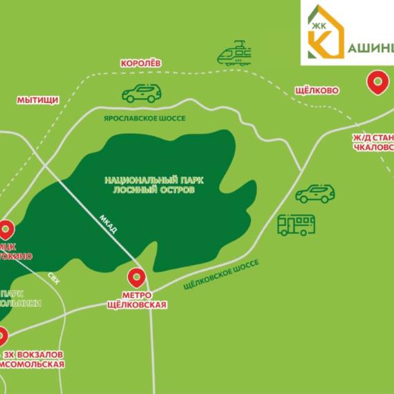ЖК «Кашинцево», окруженный лесным массивом, находится на территории Лосино-Петровского городского округа, в поселке Биокомбината. Рядом с развитым подмосковным городом Щёлково.