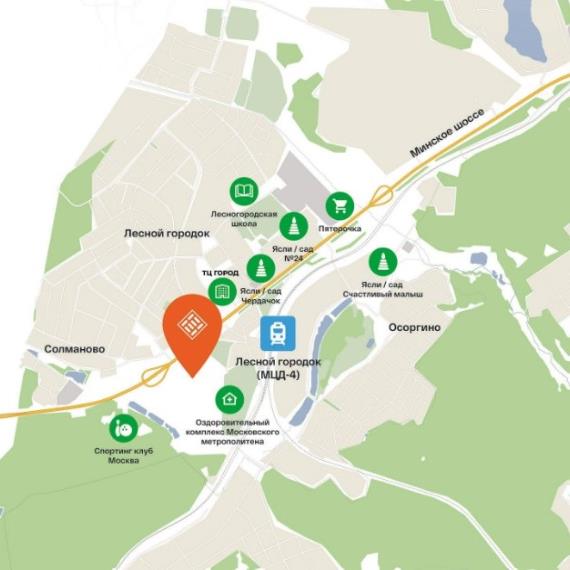 В дачном поселке Лесной городок находится ТЦ "Город".