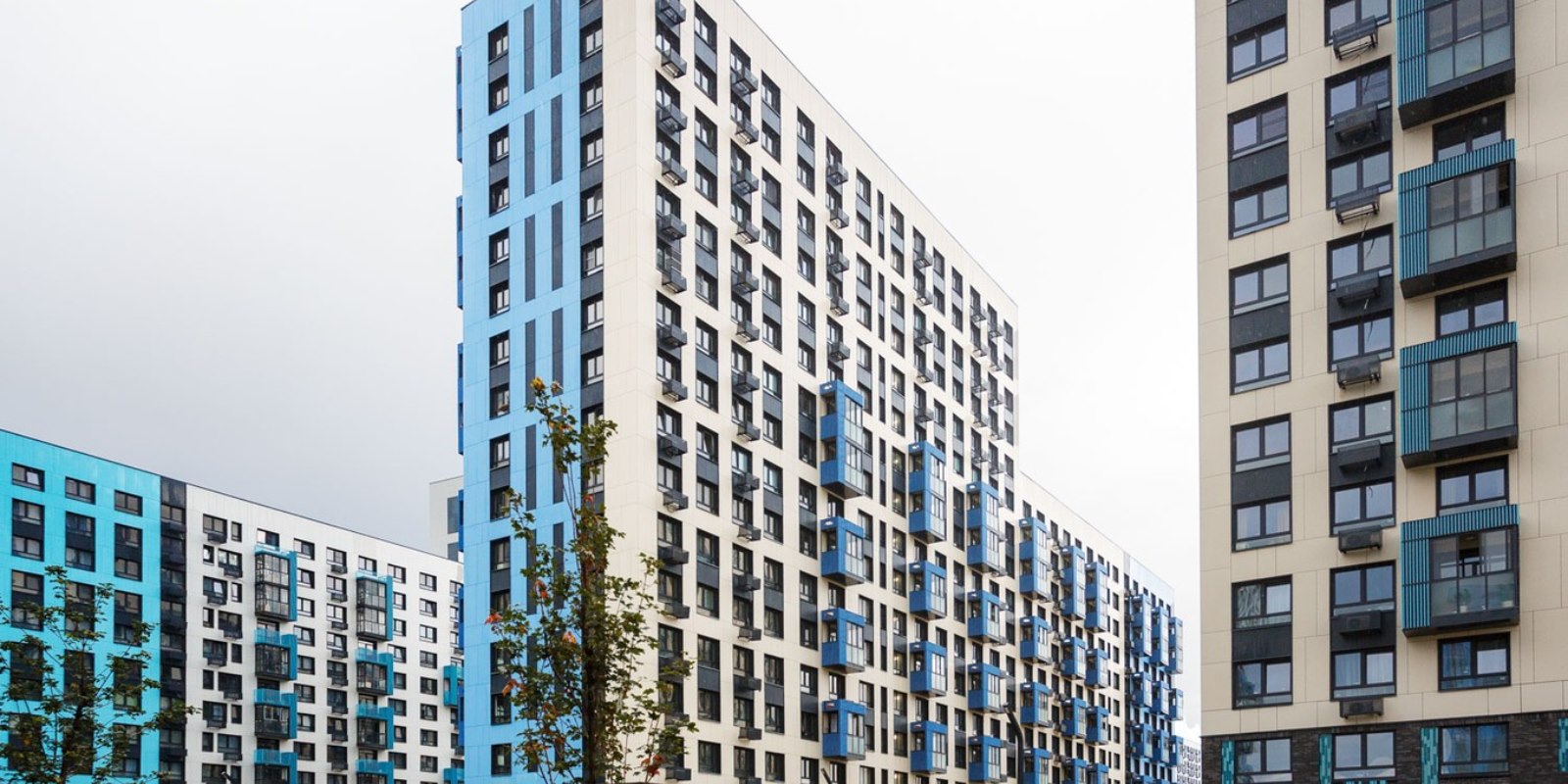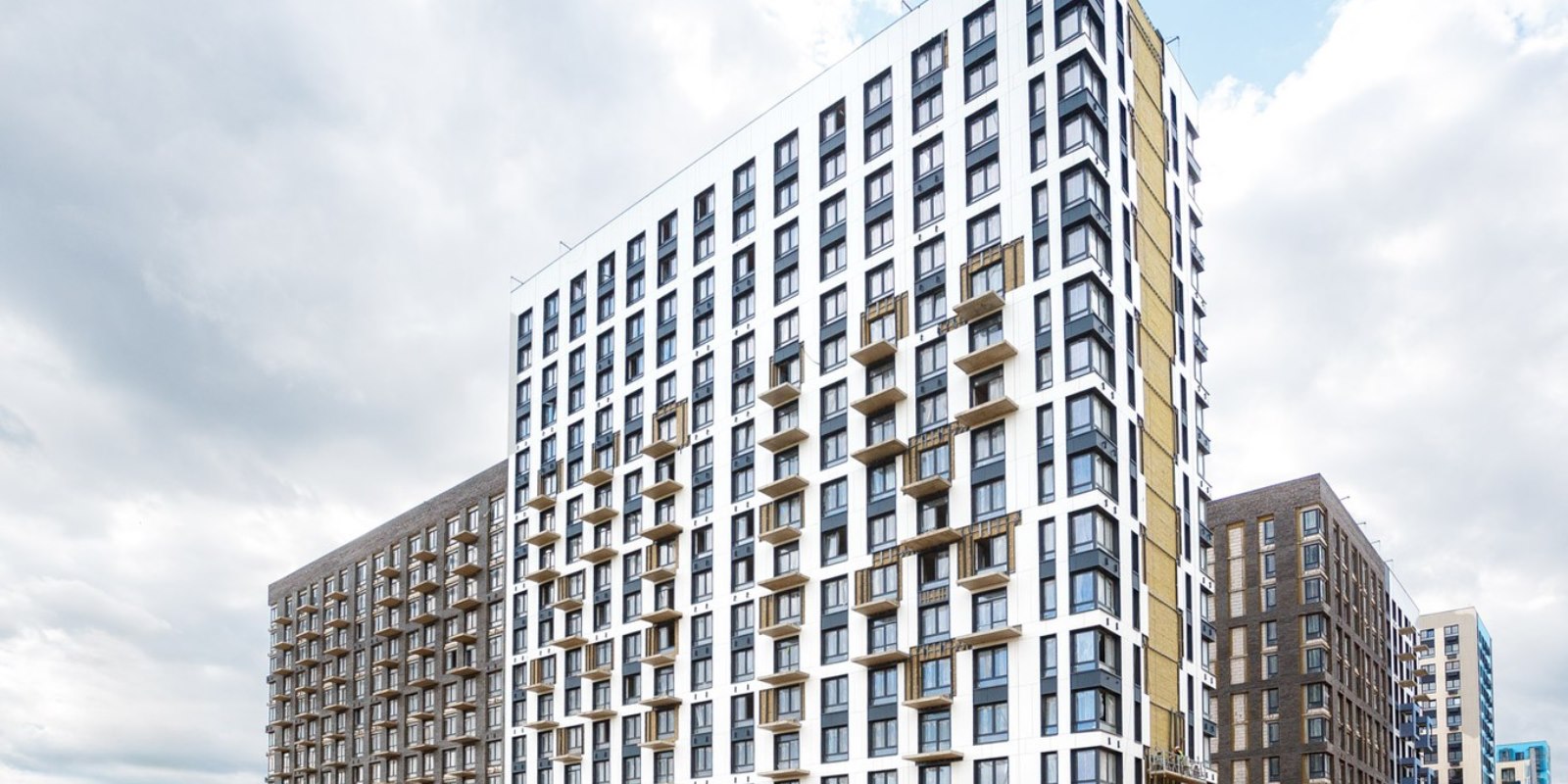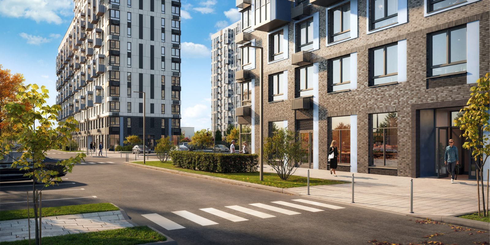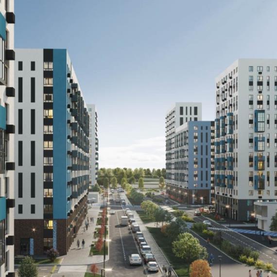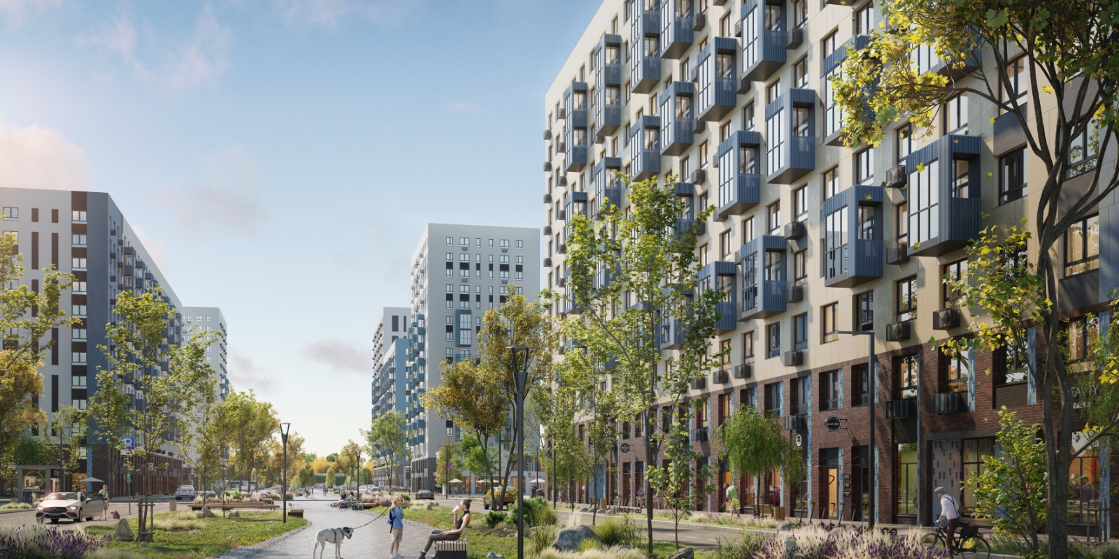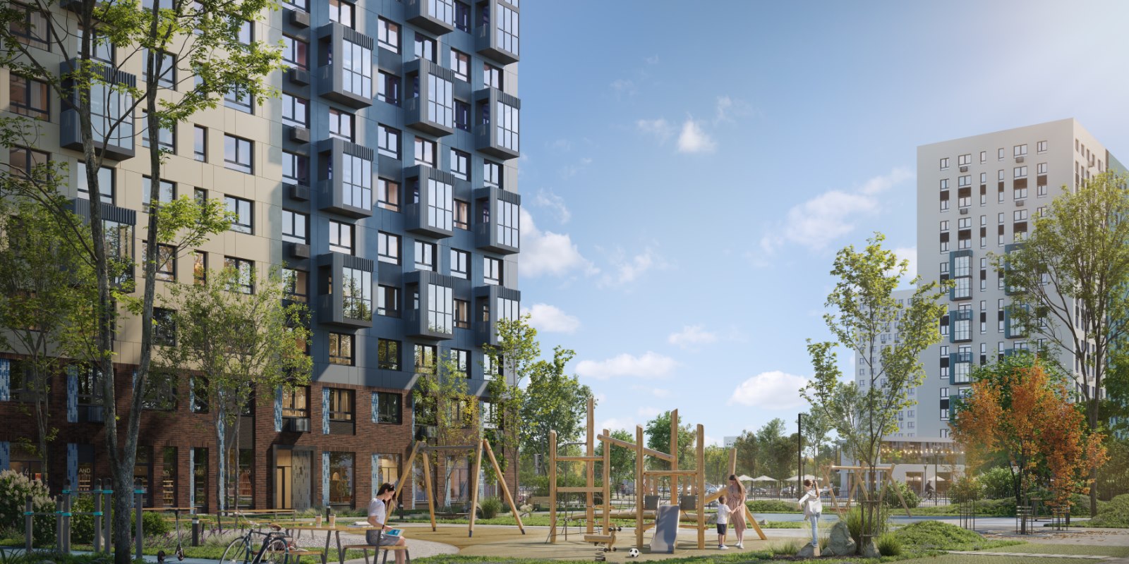 Монолитные дома высотой 12–17 этажей с комбинированными фасадами из кирпича и фиброцементных плит как будто всегда здесь были — так гармонично они выглядят в природном ландшафте.