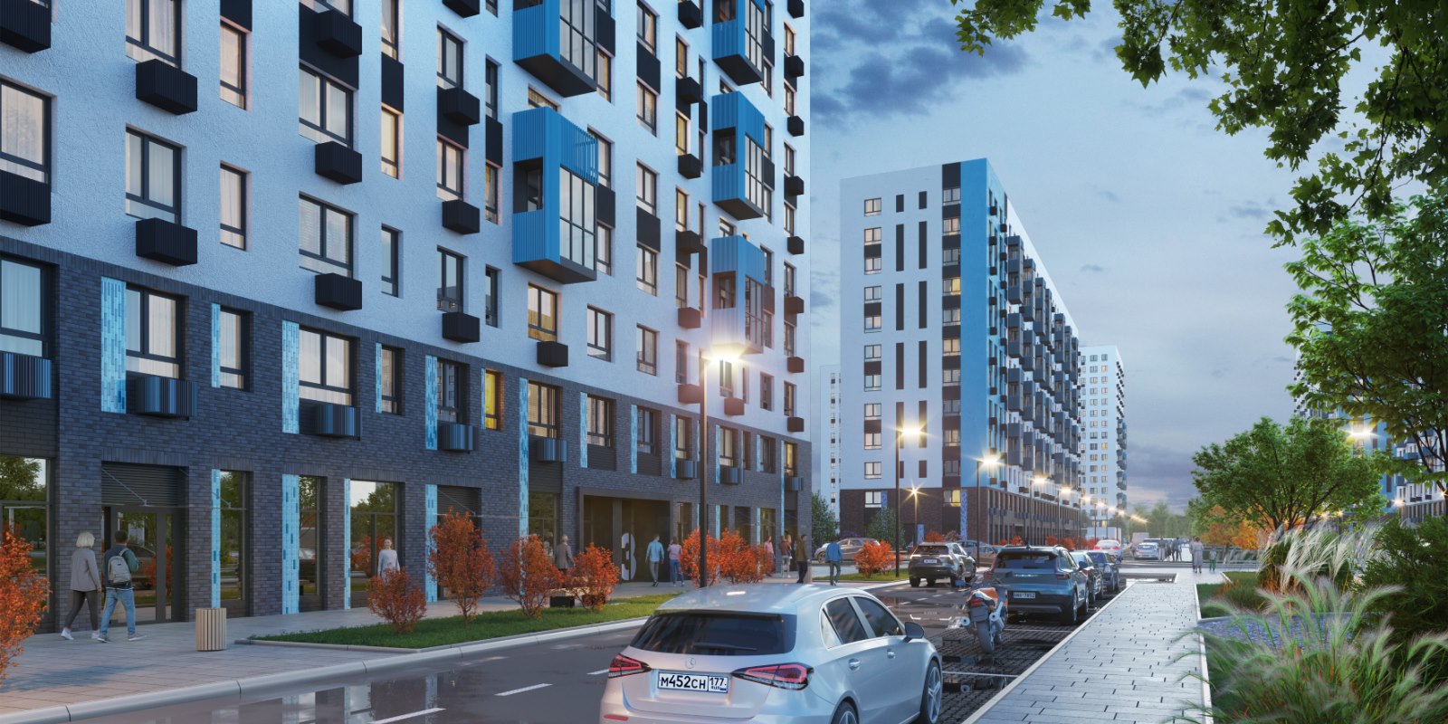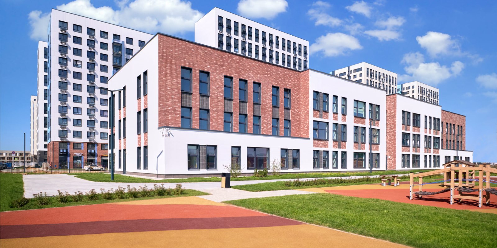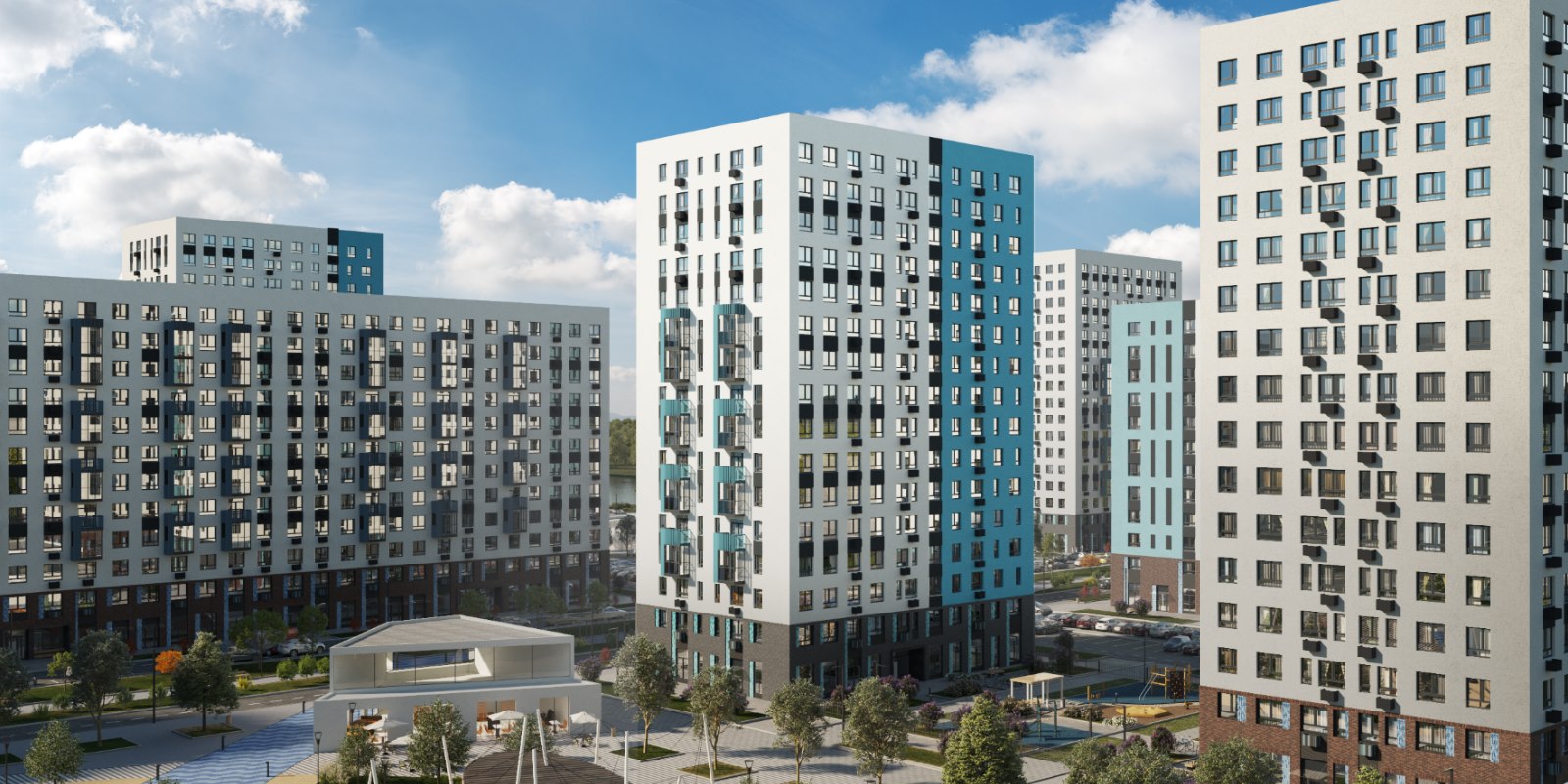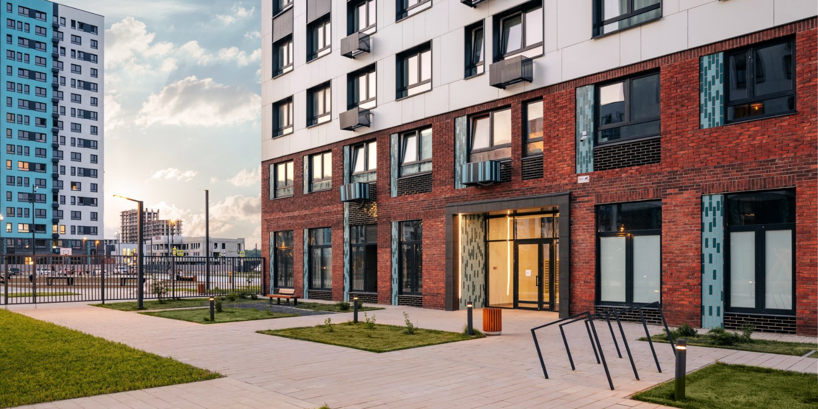Монолитные дома высотой 12–17 этажей с комбинированными фасадами из кирпича и фиброцементных плит как будто всегда здесь были — так гармонично они выглядят в природном ландшафте.