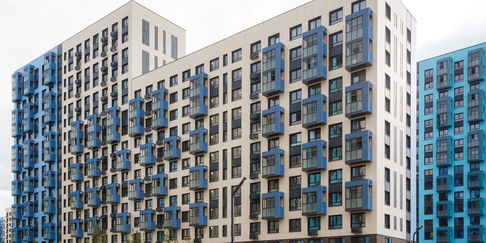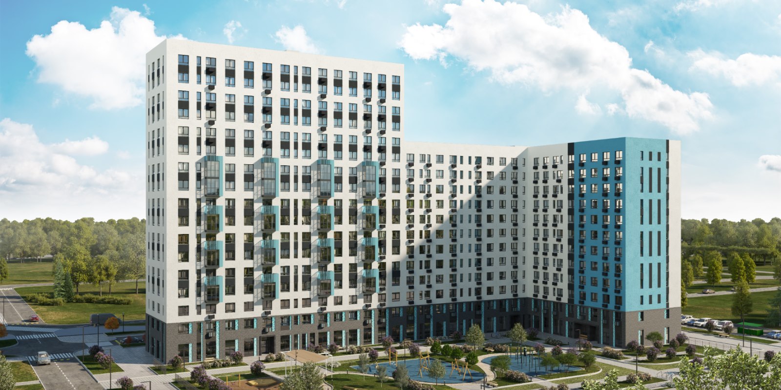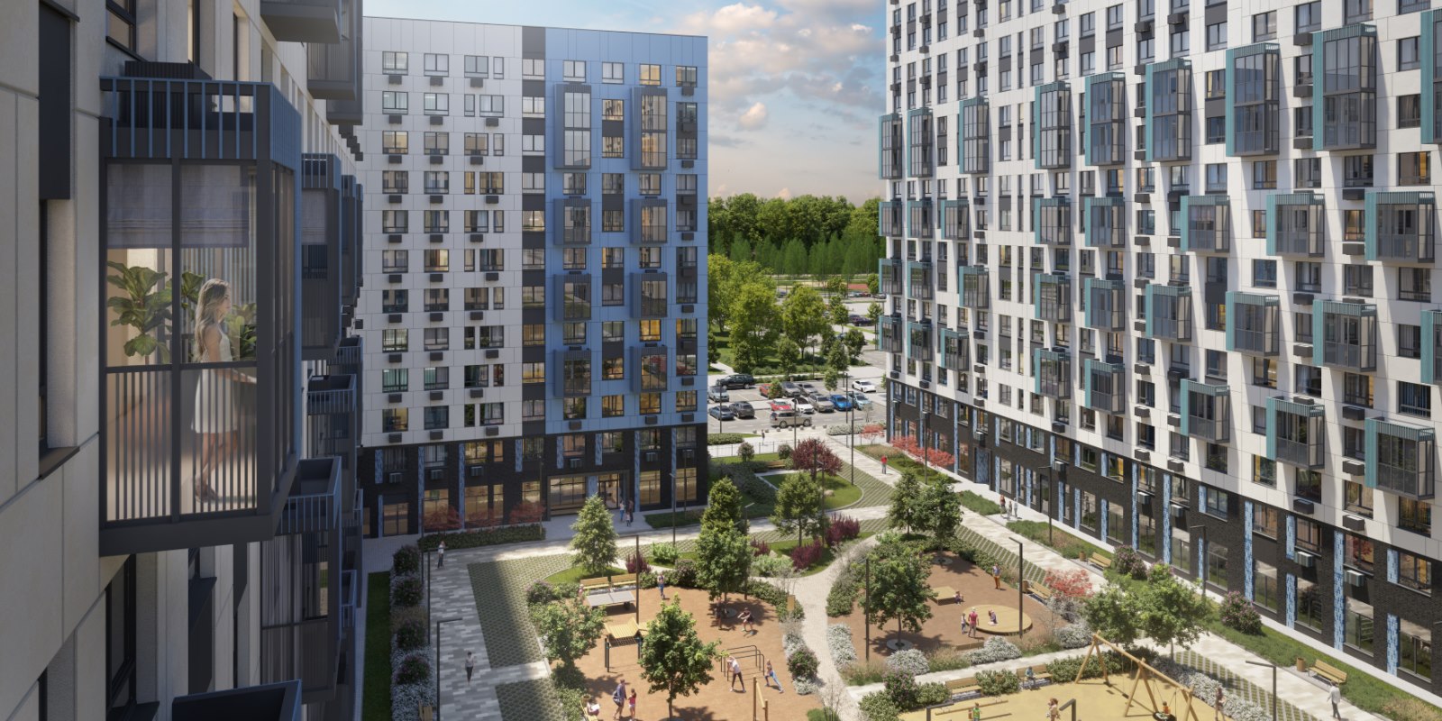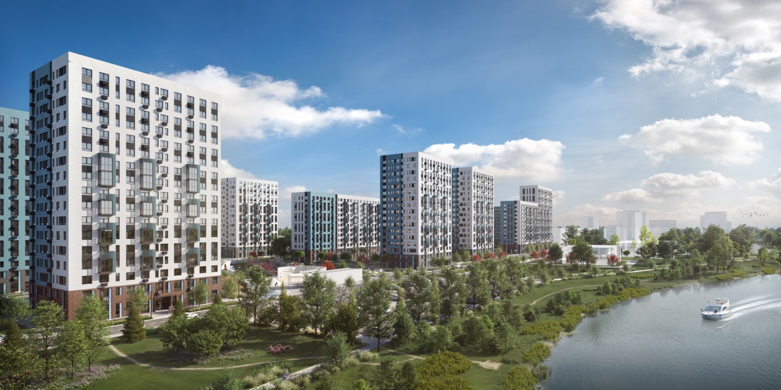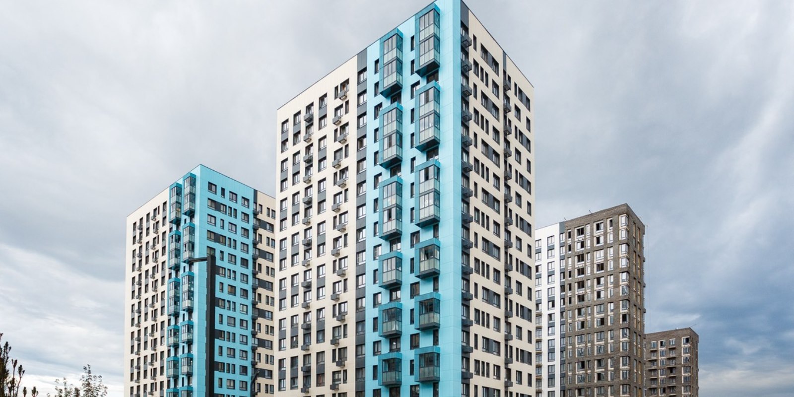 Монолитные дома высотой 12–17 этажей с комбинированными фасадами из кирпича и фиброцементных плит как будто всегда здесь были — так гармонично они выглядят в природном ландшафте.