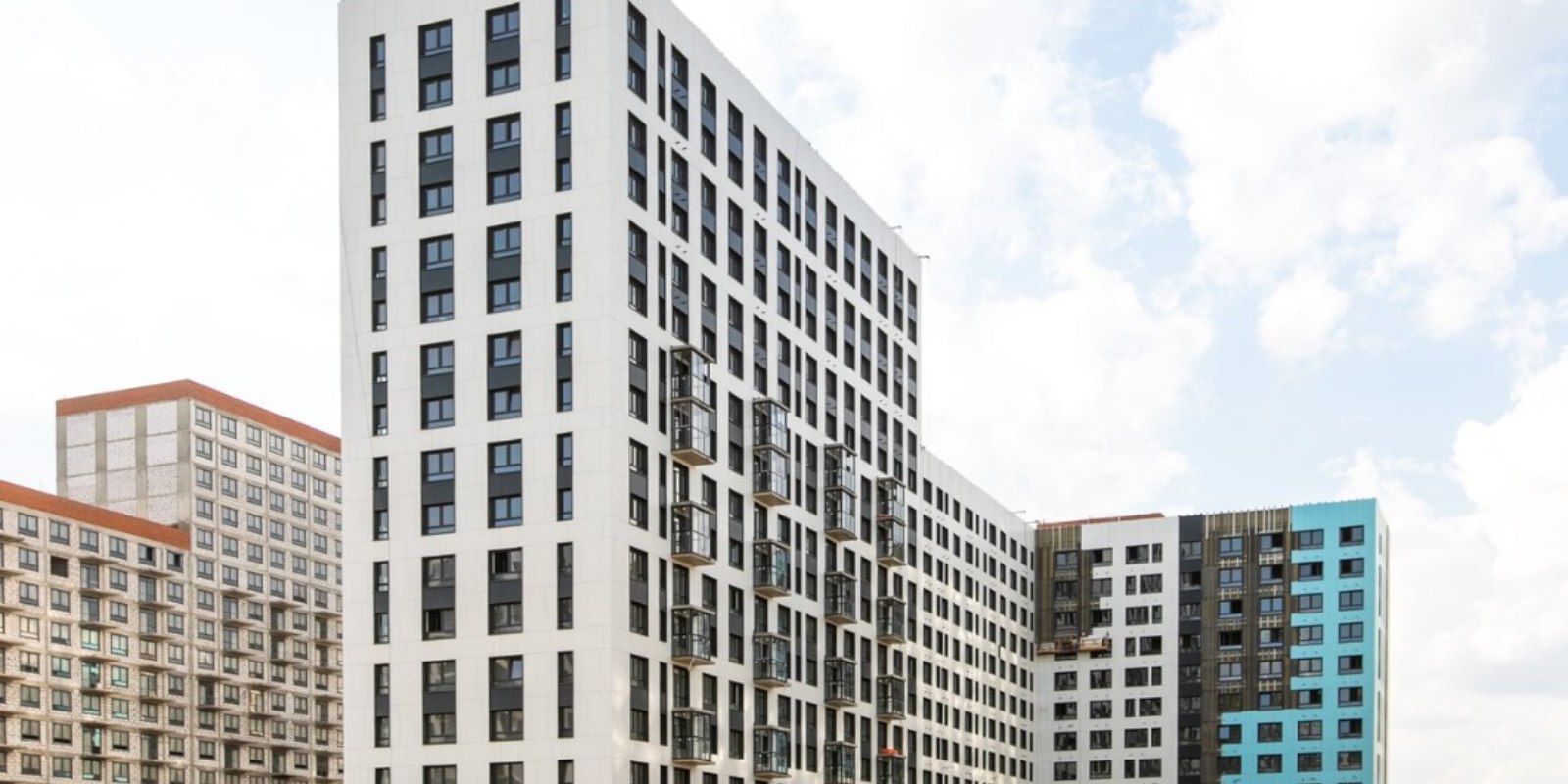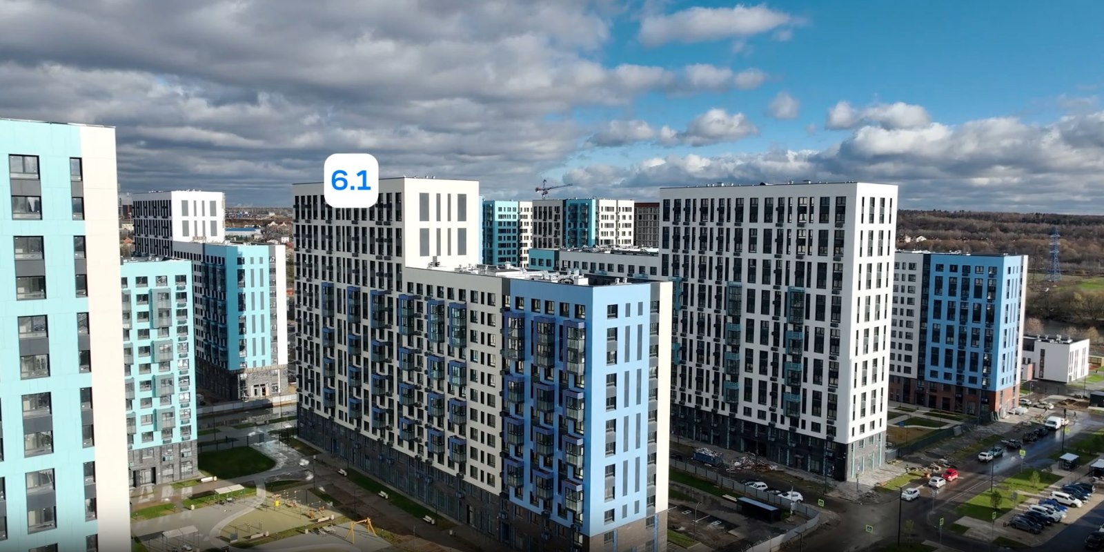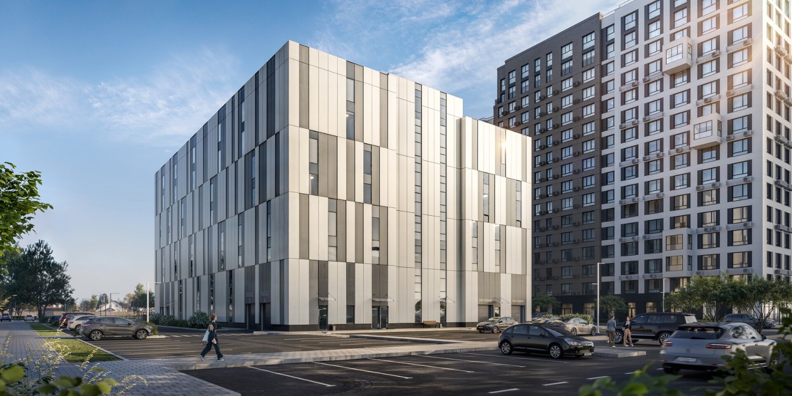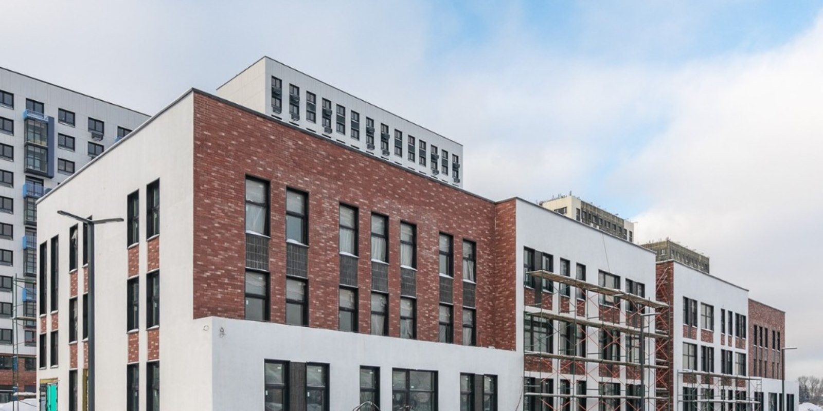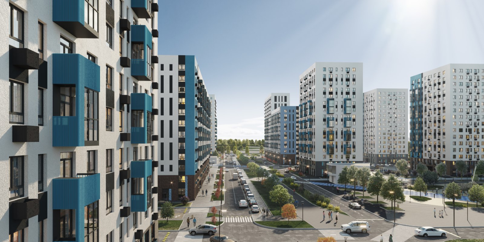 Монолитные дома высотой 12–17 этажей с комбинированными фасадами из кирпича и фиброцементных плит как будто всегда здесь были — так гармонично они выглядят в природном ландшафте.