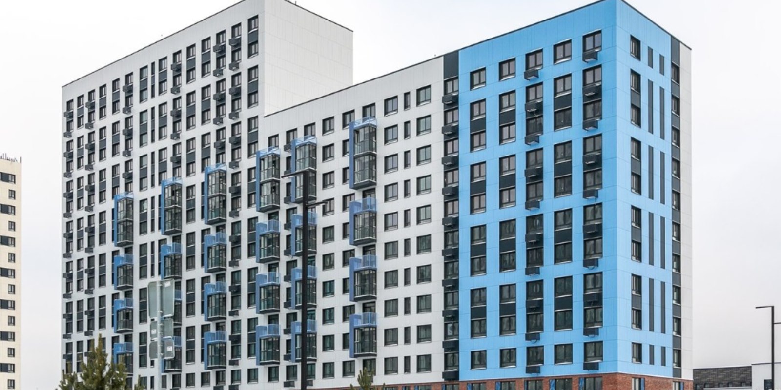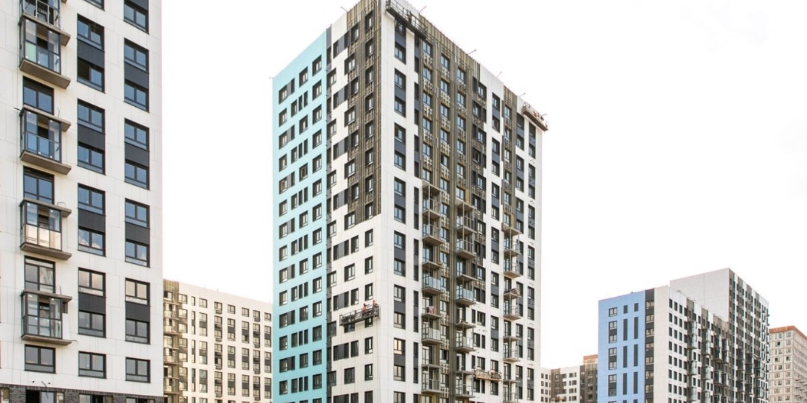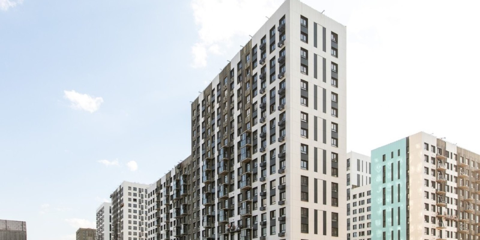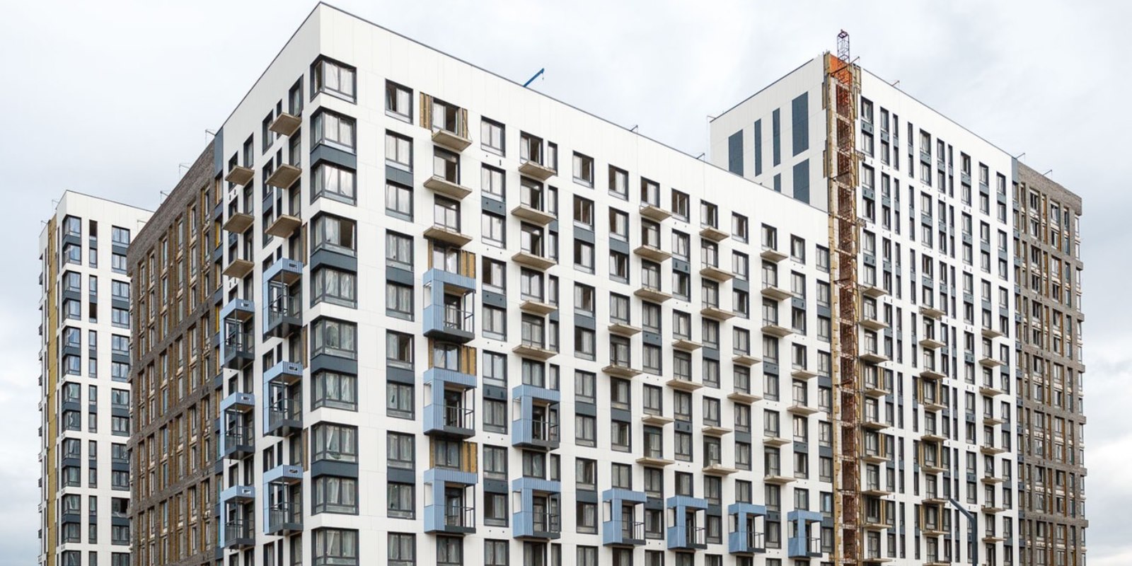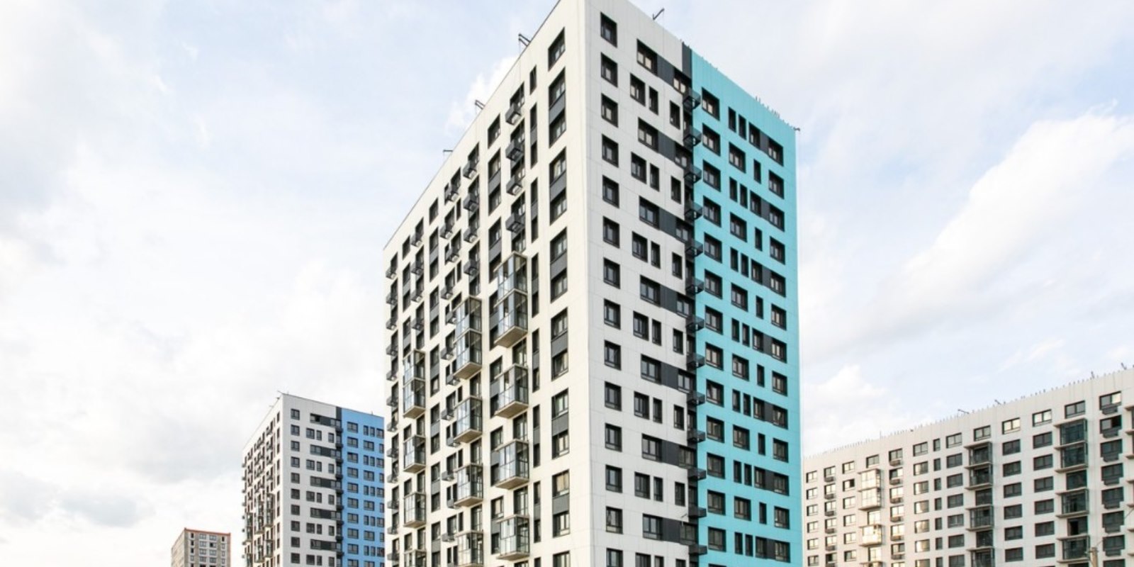 Монолитные дома высотой 12–17 этажей с комбинированными фасадами из кирпича и фиброцементных плит как будто всегда здесь были — так гармонично они выглядят в природном ландшафте.