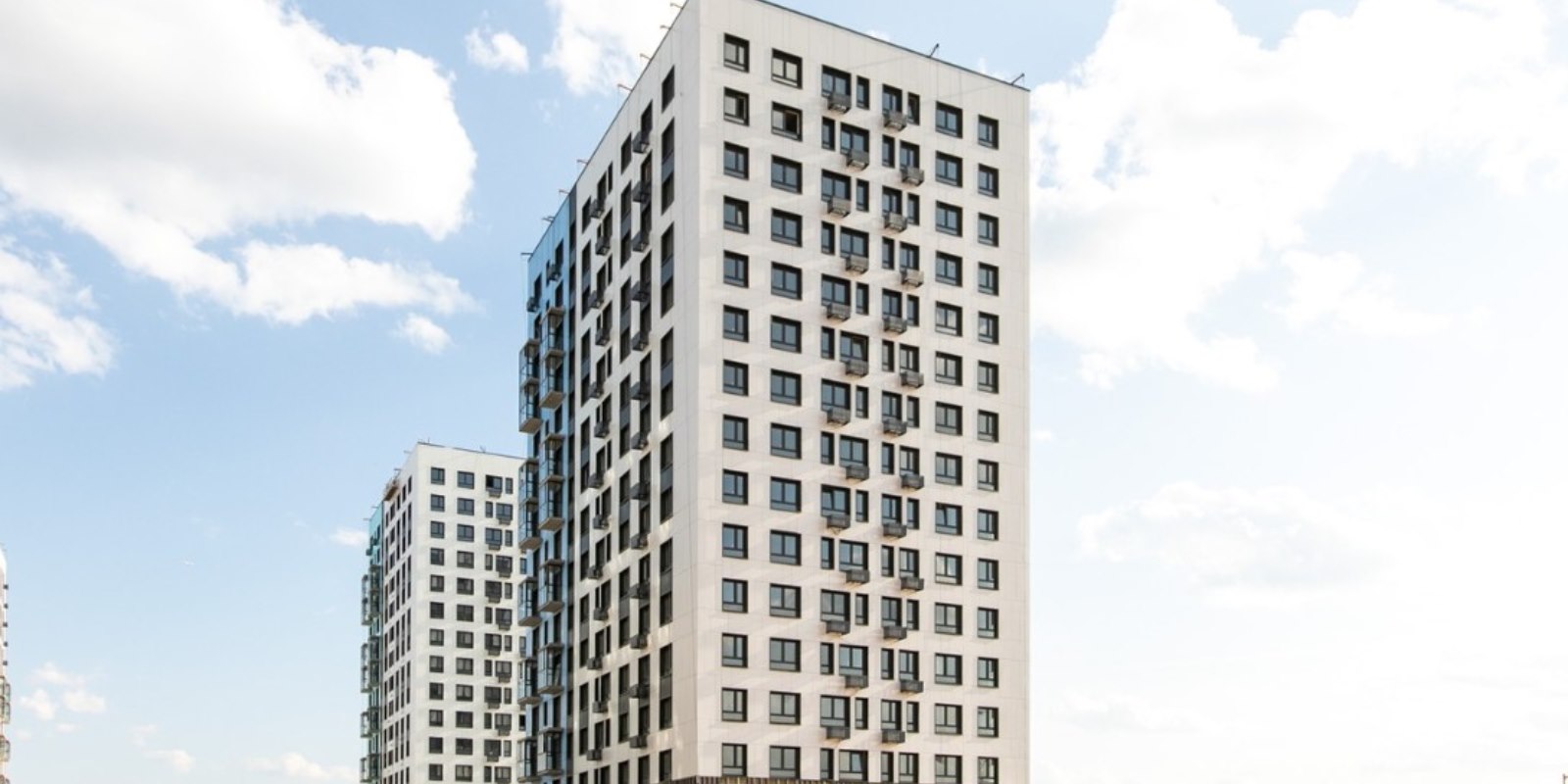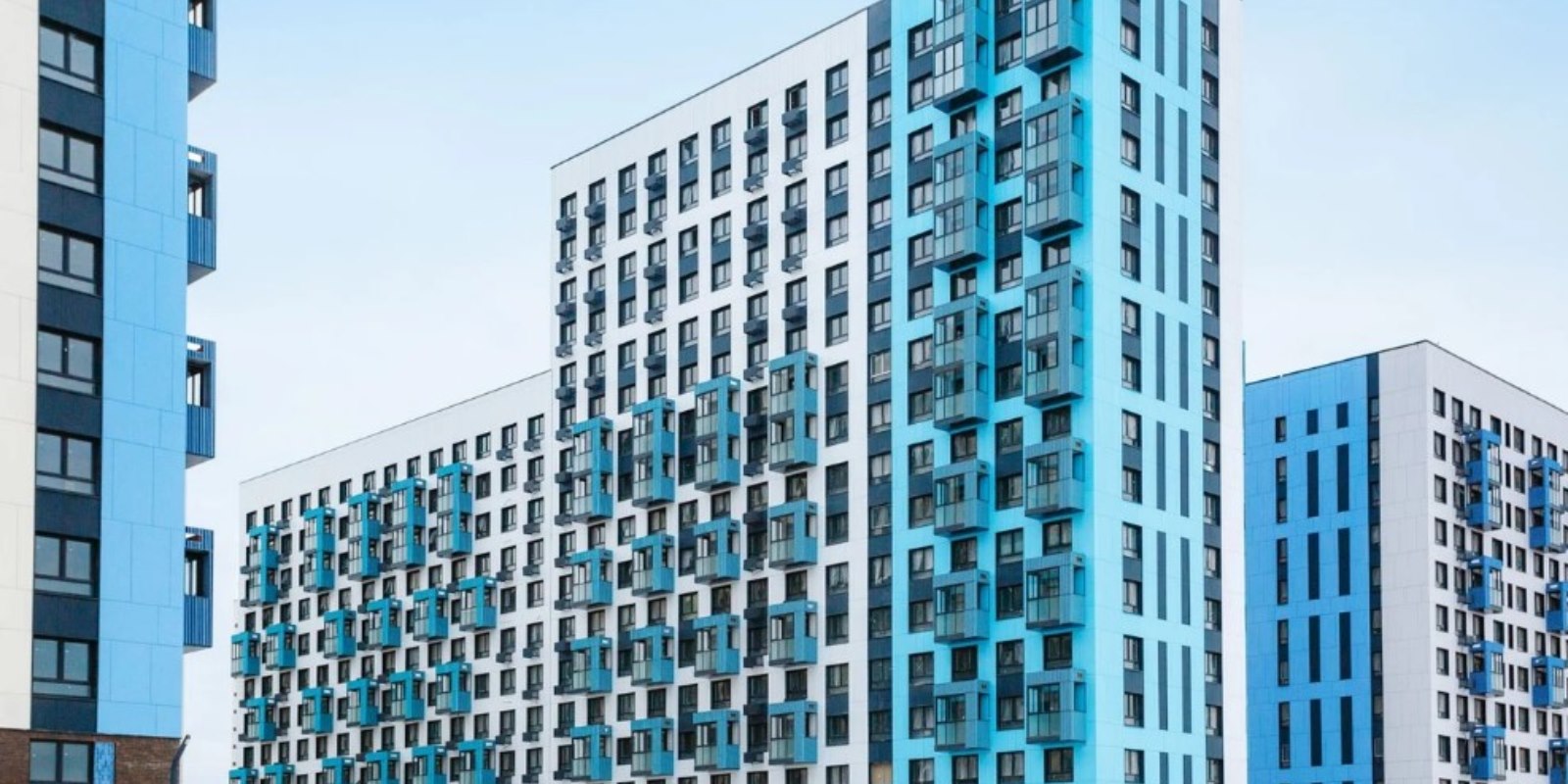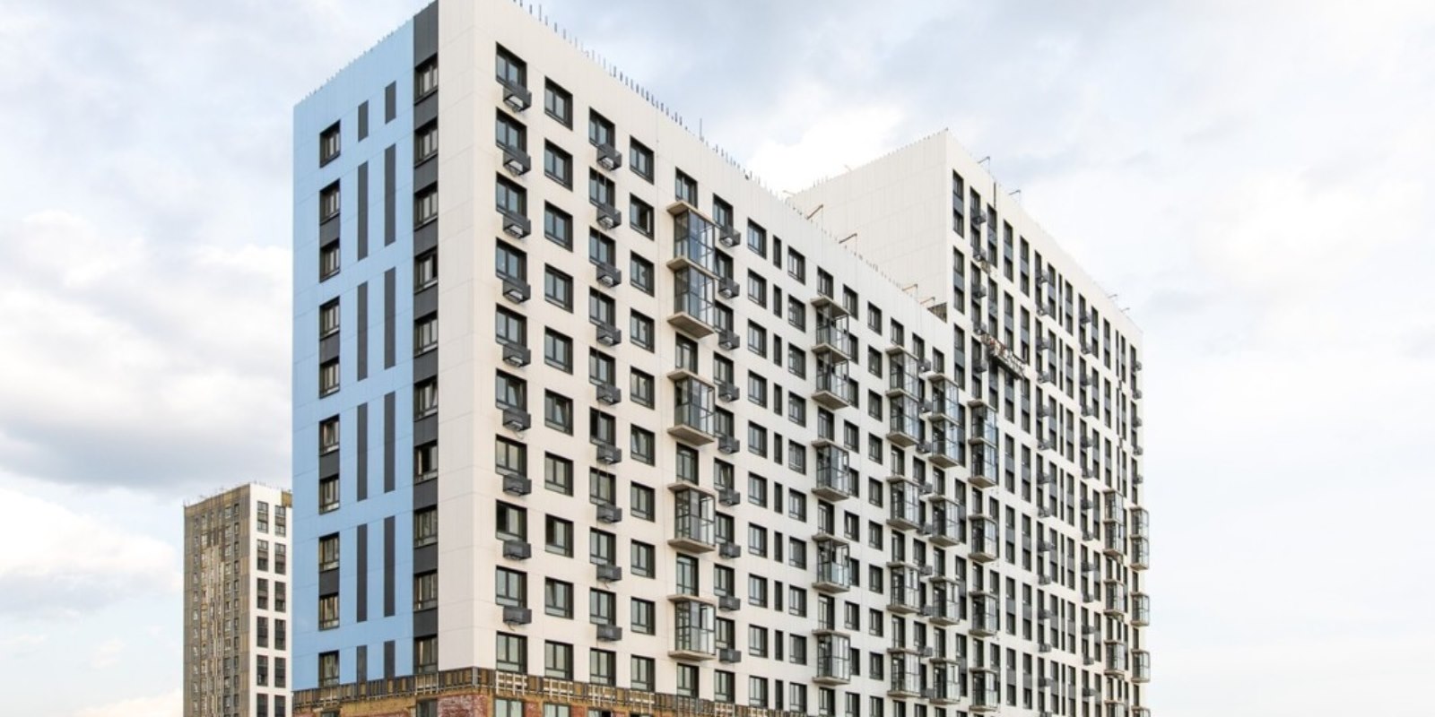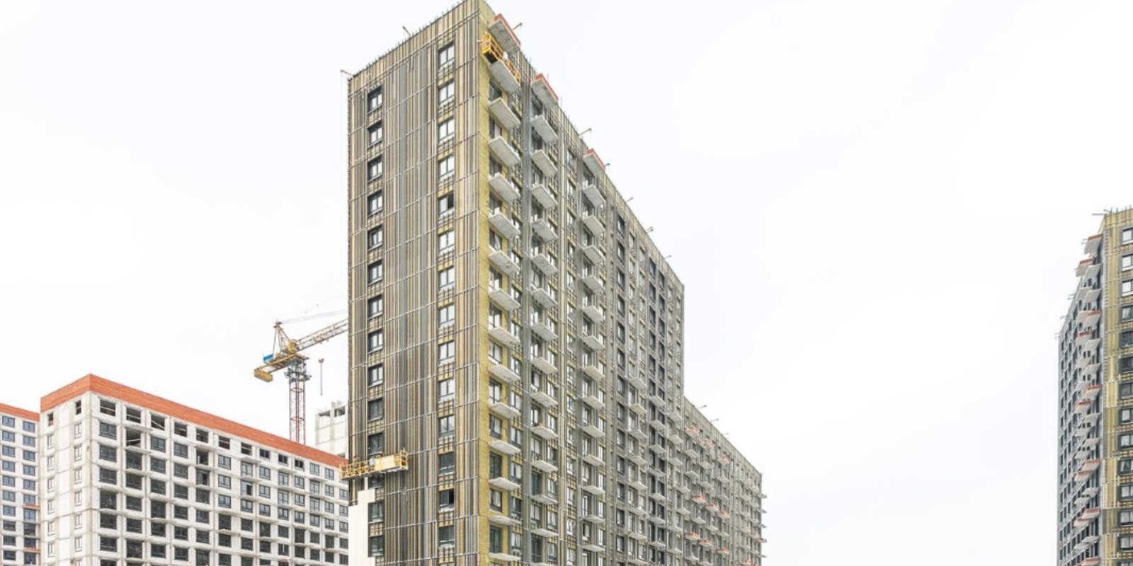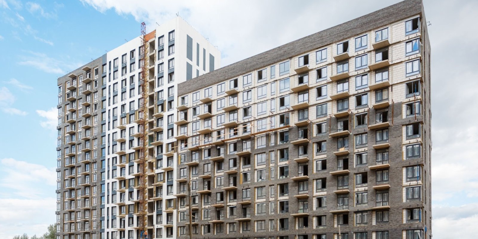 Монолитные дома высотой 12–17 этажей с комбинированными фасадами из кирпича и фиброцементных плит как будто всегда здесь были — так гармонично они выглядят в природном ландшафте.
