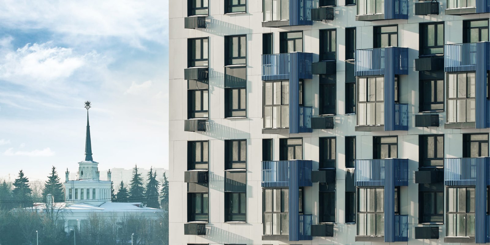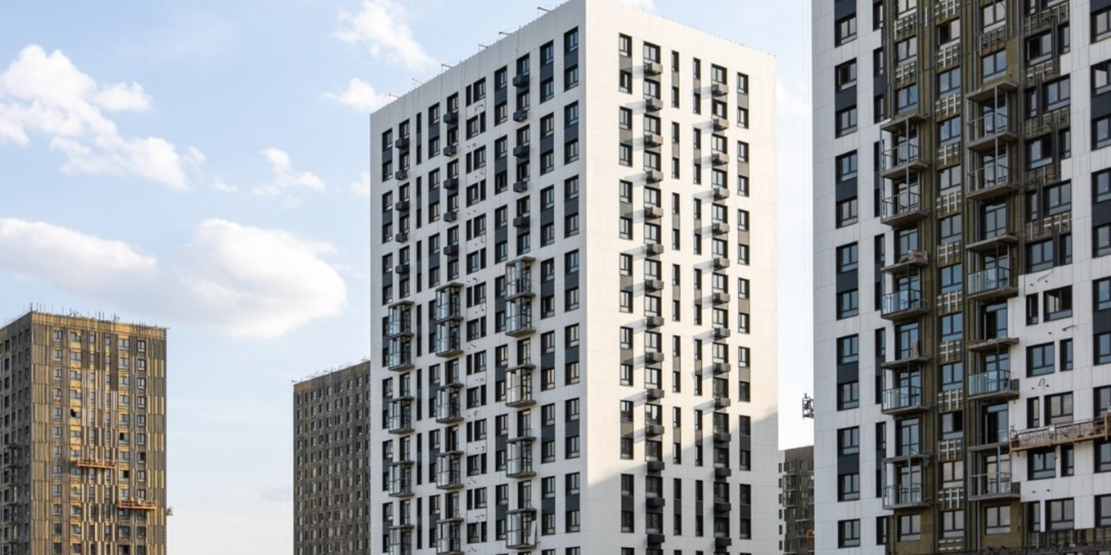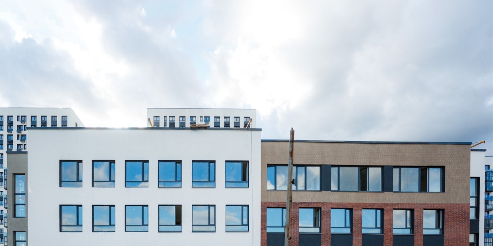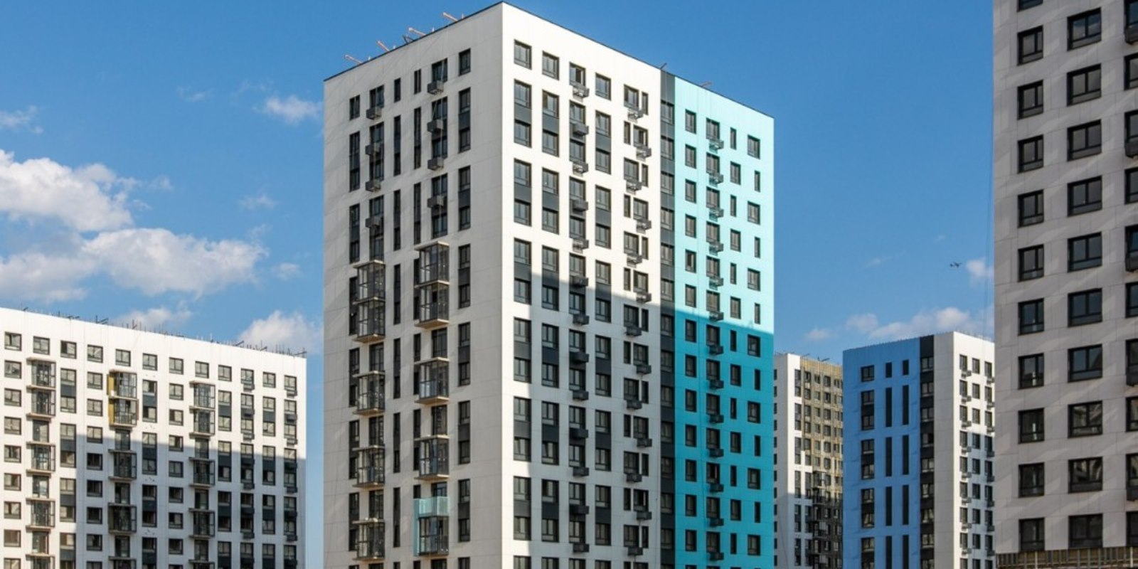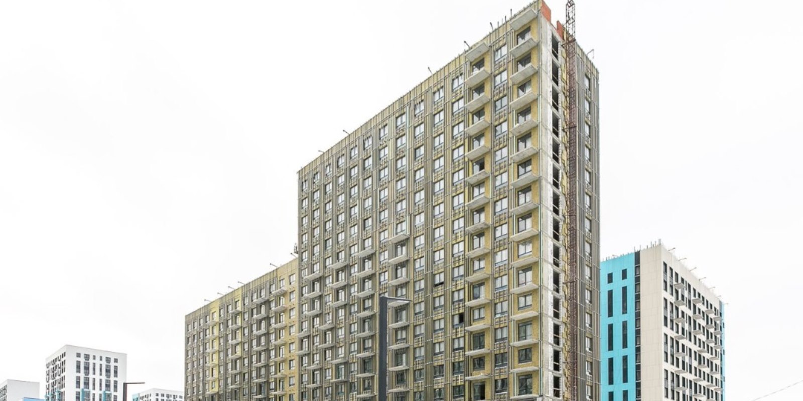 Монолитные дома высотой 12–17 этажей с комбинированными фасадами из кирпича и фиброцементных плит как будто всегда здесь были — так гармонично они выглядят в природном ландшафте.
