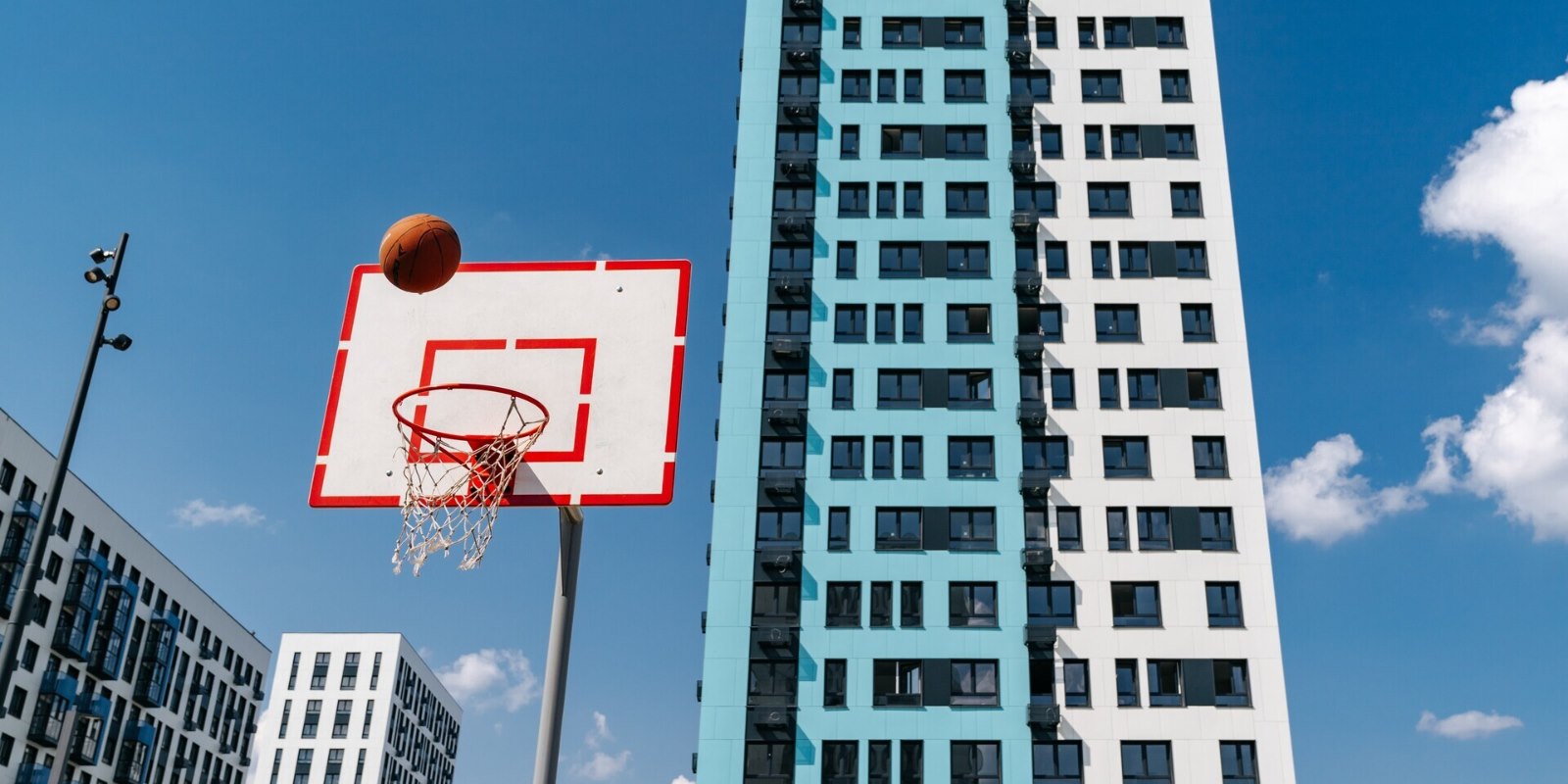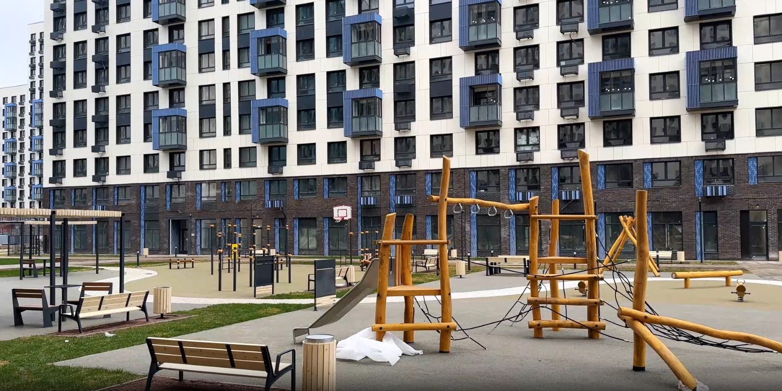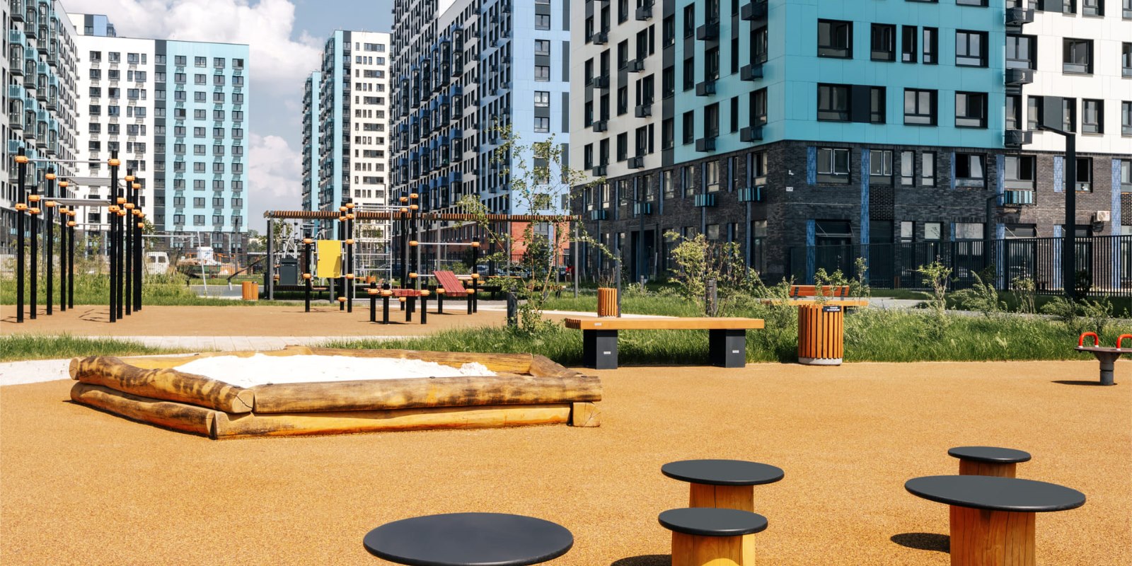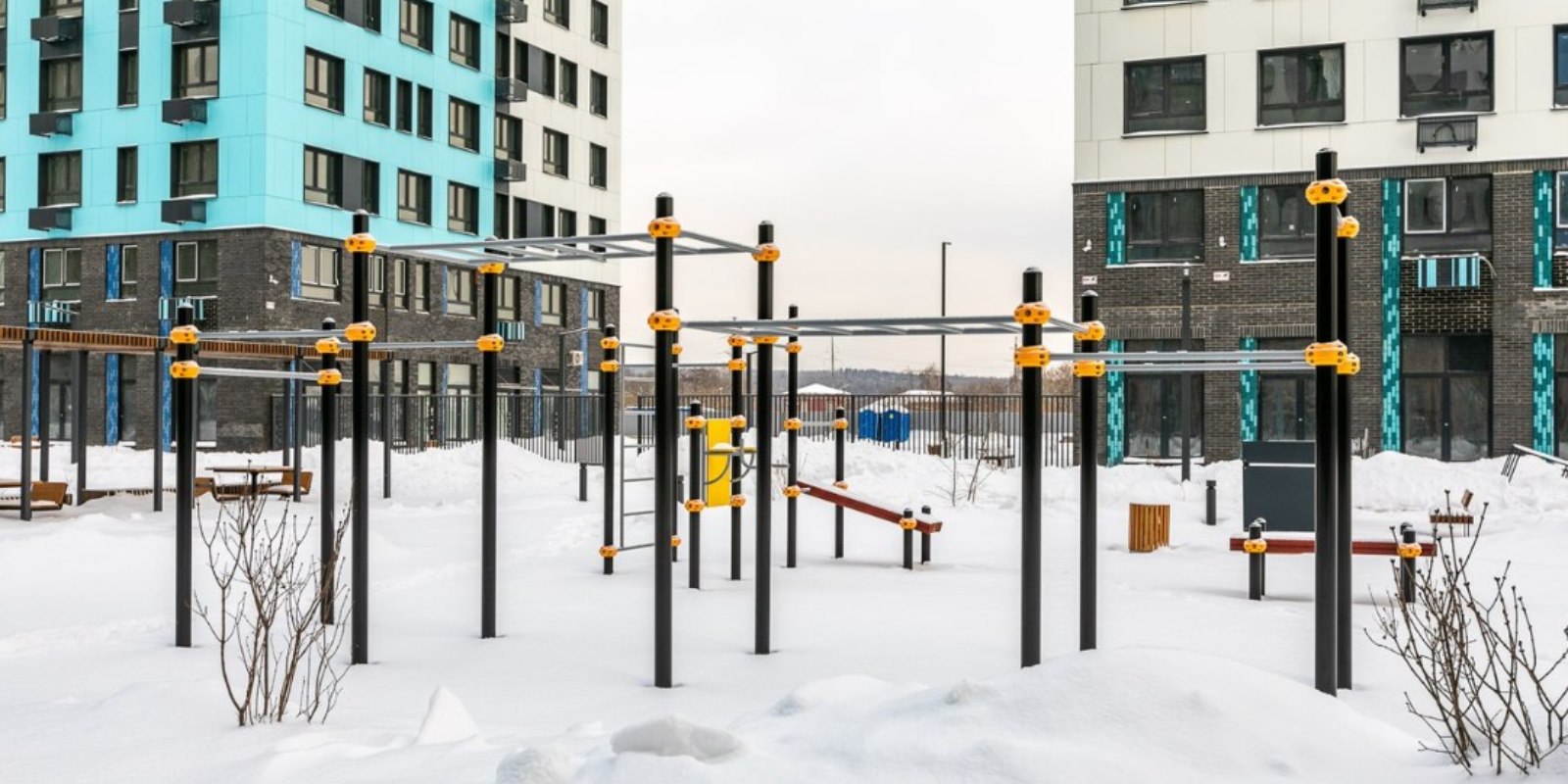 Для занятий спортом - современная воркаут-площадка, лужайки для йоги. Футбольное и баскетбольное поля находятся за пределами двора.