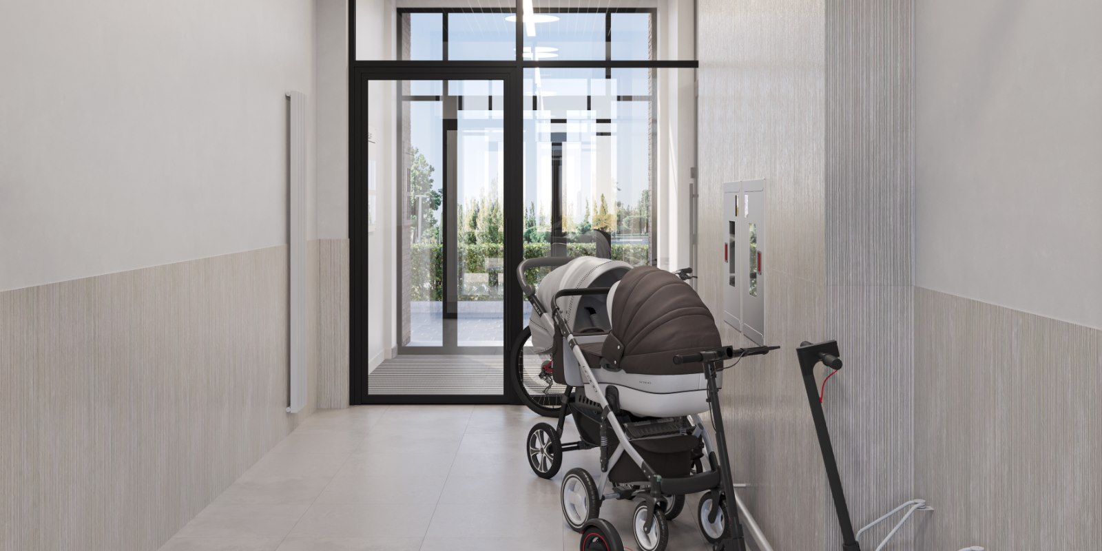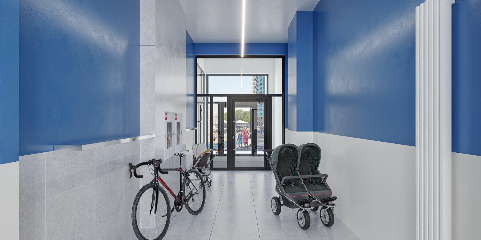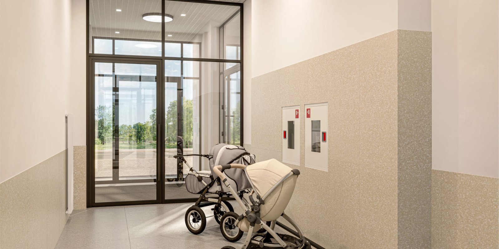 На минус первом этаже будут кладовые помещения для хранения сезонных вещей, а в лобби — колясочные. Все входы в подъезды расположены на уровне земли: никаких преград на пути домой.