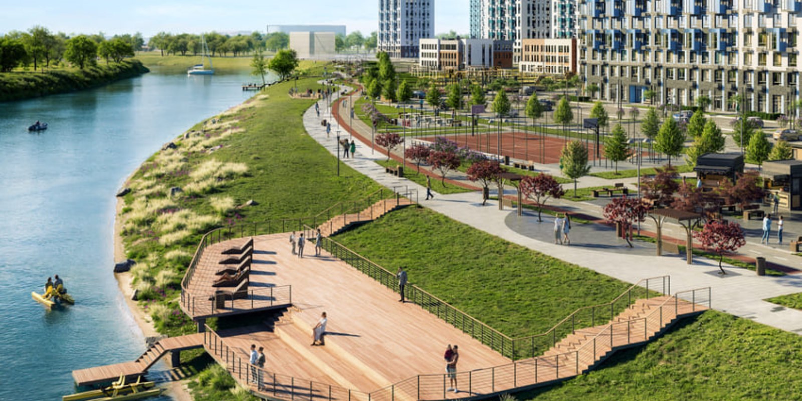 Дворы "Прибрежного Парка" - продуманные пространства для отдыха и активного времяпрепровождения. Всю территорию проекта огибает благоустроенная набережная. Прогулочный бульвар "Речной берег" со стрит-ретейлом пройдет в центральной части жилого комплекса. Здесь же - сеть велодорожек и пешеходных аллей.