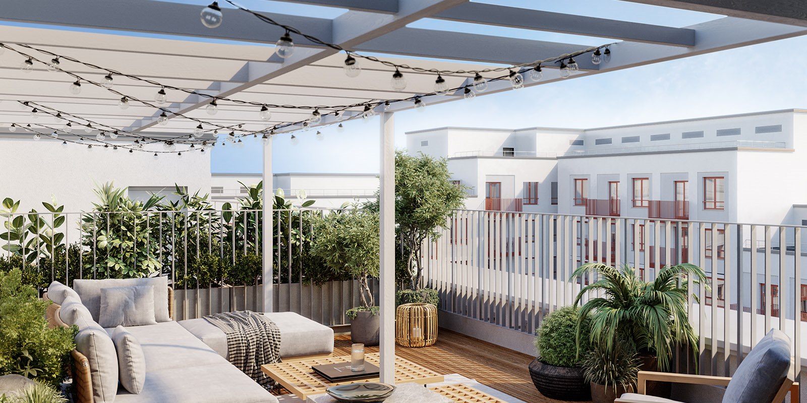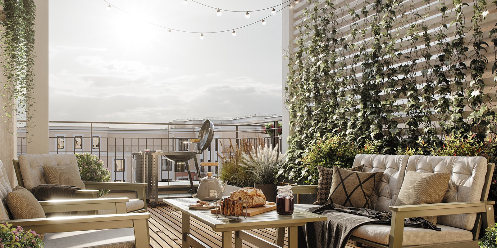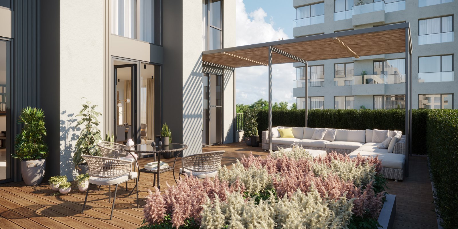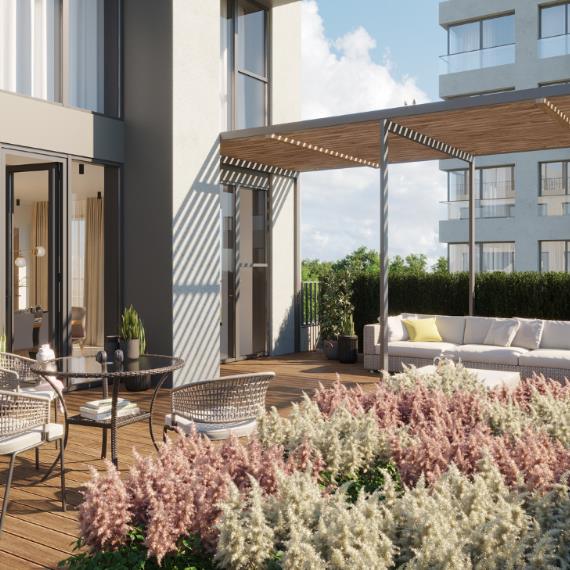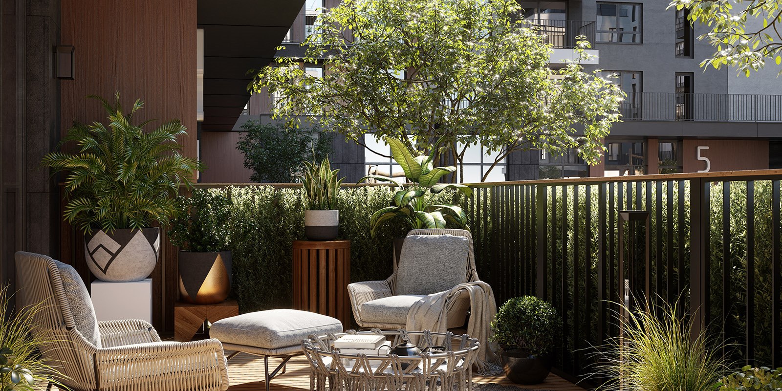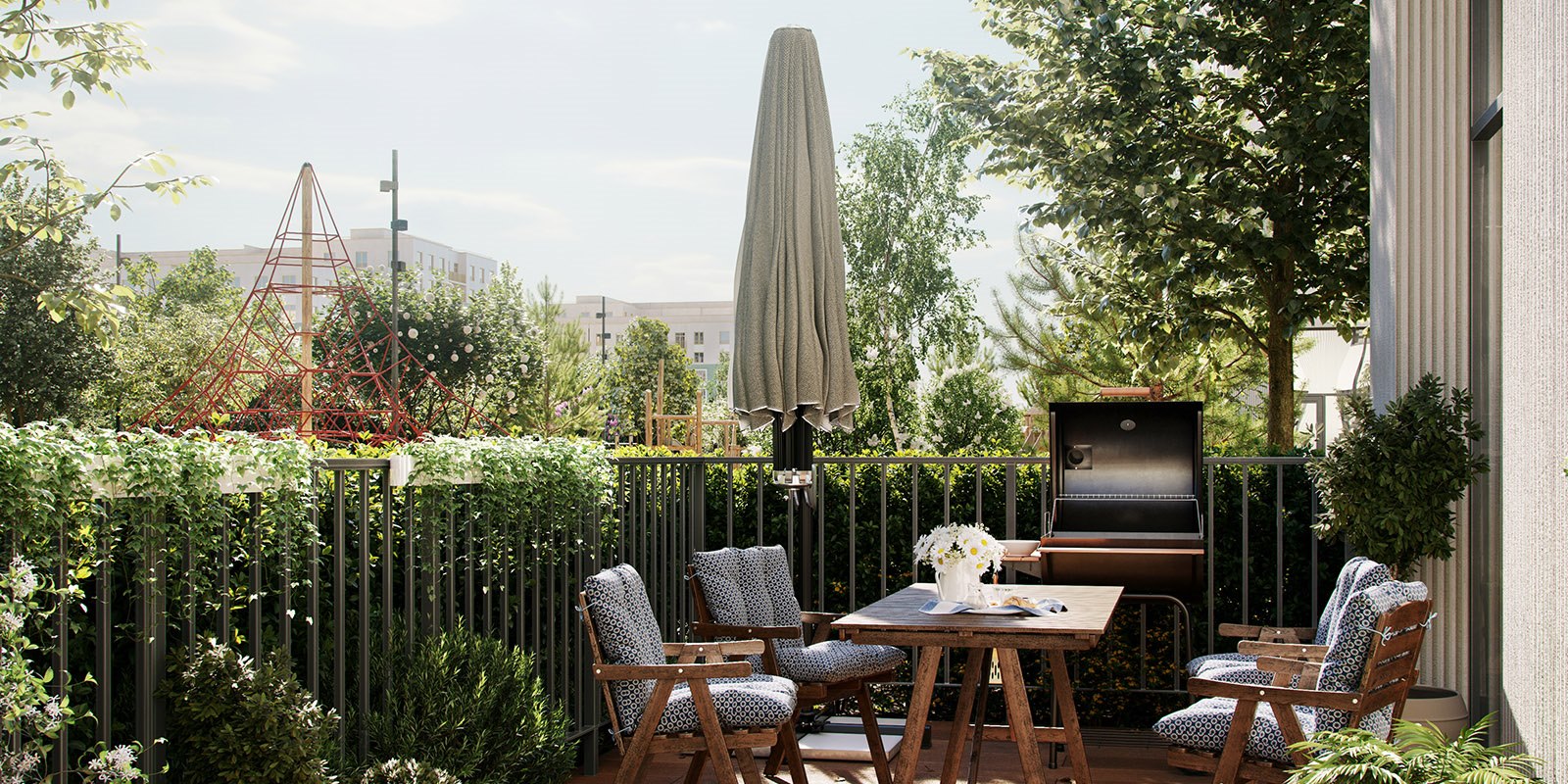 У квартир на первых и последних этажах есть террасы. Они расширяют жилое пространство и дают возможность разнообразить досуг. Летом здесь можно поставить барбекю, организовать место для детских игр или или отдыха в окружении зелени. Зимой на террасах ставят новогодние елки и делают горки, дети лепят снеговиков и играют в снежки. На террасу выходят большие окна, что даёт квартире больше естественного света. На первом этаже террасу от двора отделяет зелёная изгородь обеспечивает необходимый уровень приватности.