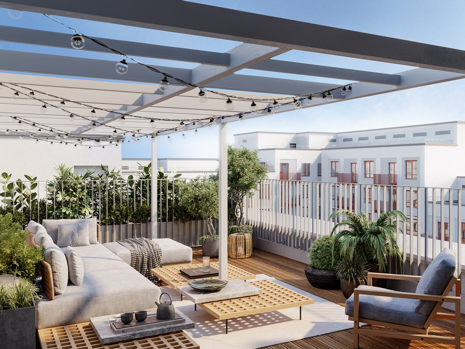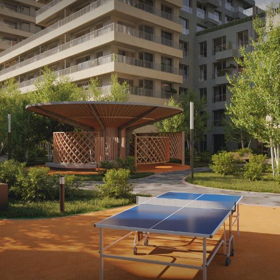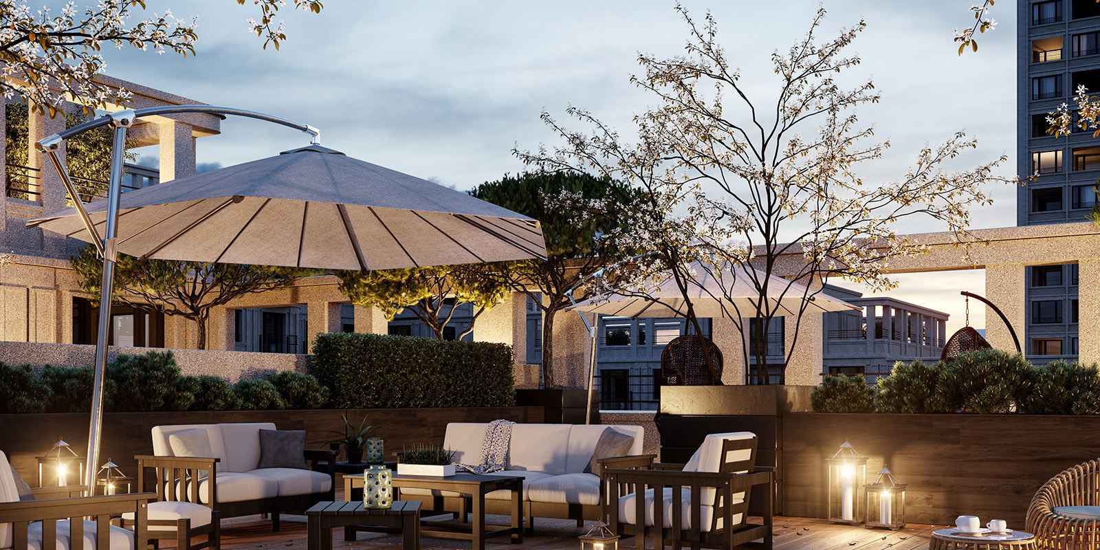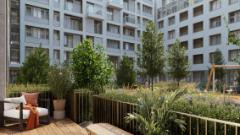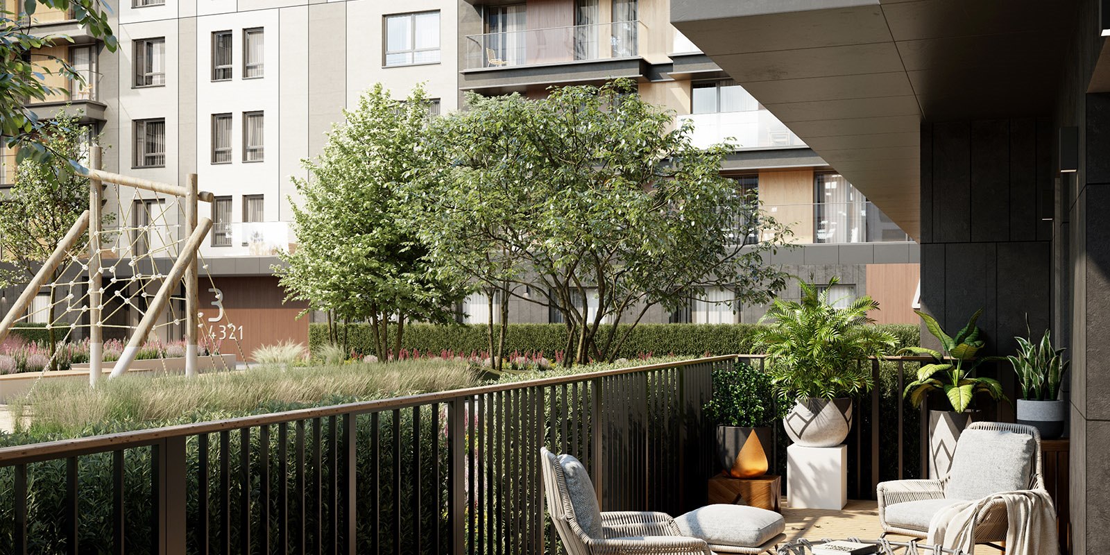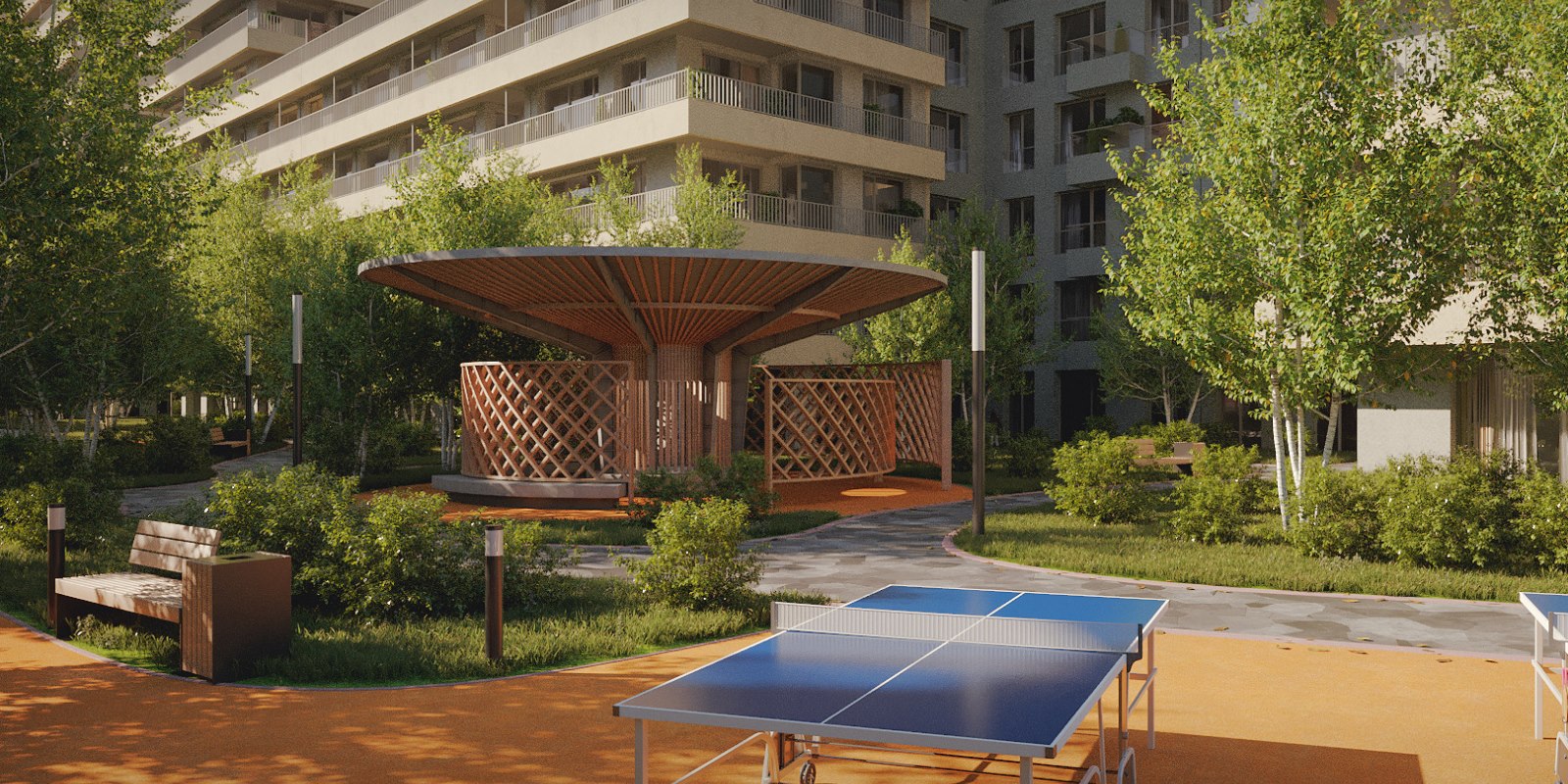 У квартир на первых и последних этажах есть террасы. Они расширяют жилое пространство и дают возможность разнообразить досуг. Летом здесь можно поставить барбекю, организовать место для детских игр или или отдыха в окружении зелени. Зимой на террасах ставят новогодние елки и делают горки, дети лепят снеговиков и играют в снежки. На террасу выходят большие окна, что даёт квартире больше естественного света. На первом этаже террасу от двора отделяет зелёная изгородь обеспечивает необходимый уровень приватности.
