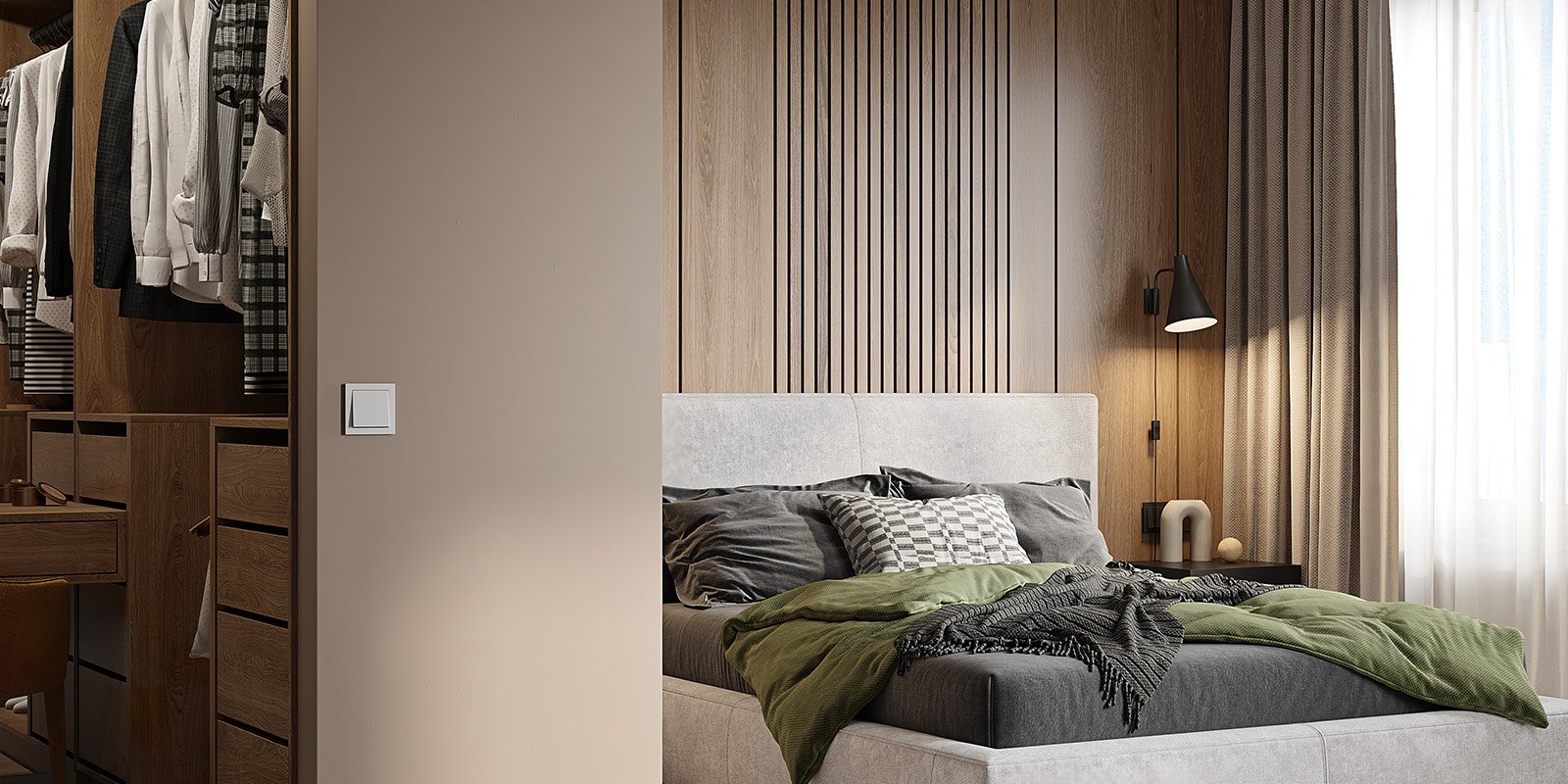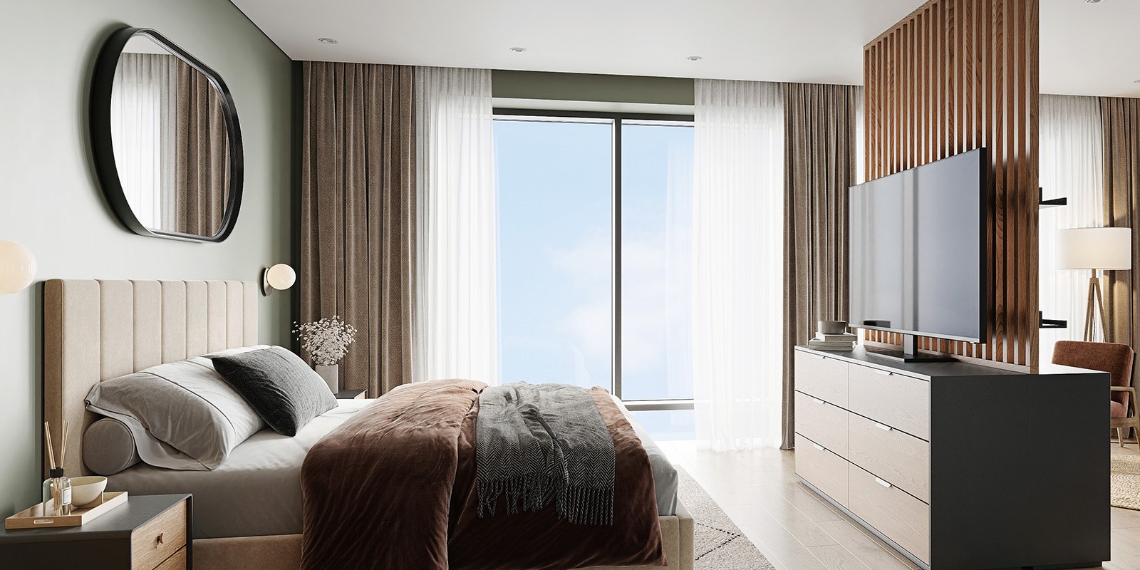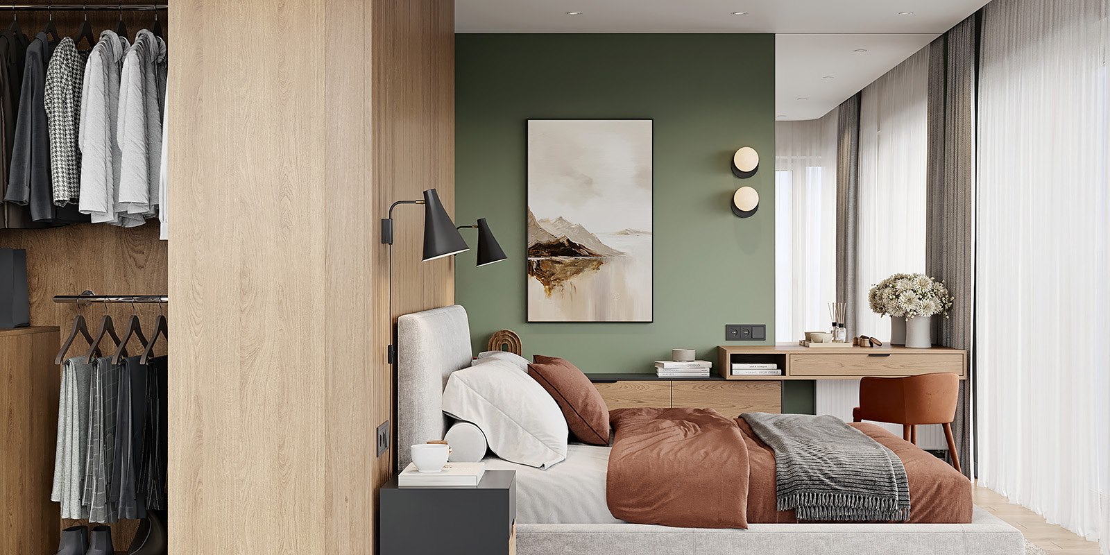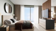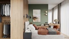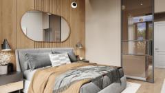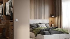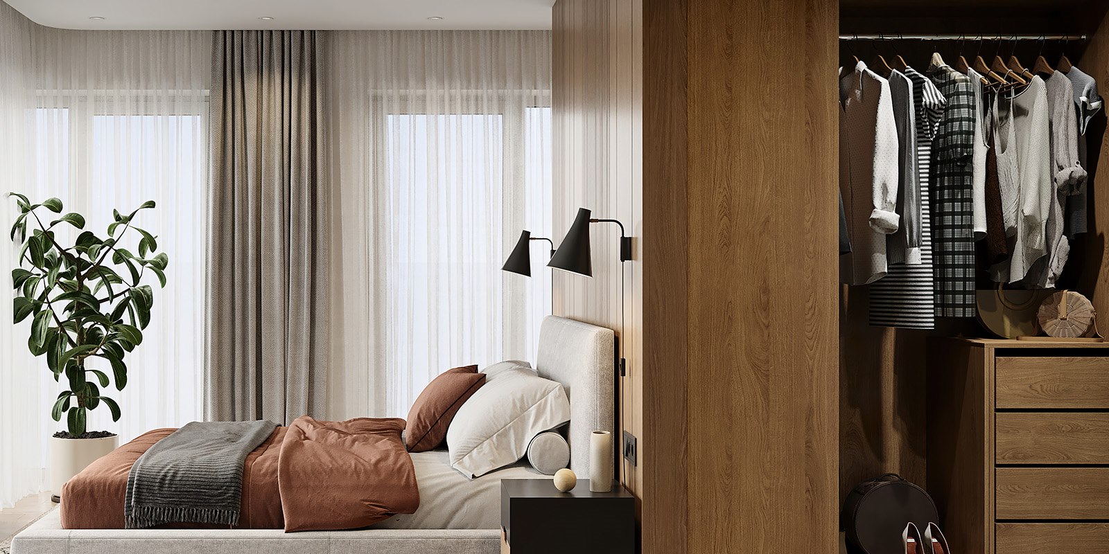 Главное отличие мастер-спальни — многофункциональность и эргономичность. Благодаря отдельным ванной и гардеробной утром удобно собираться на работу. И никакого лишнего шума.