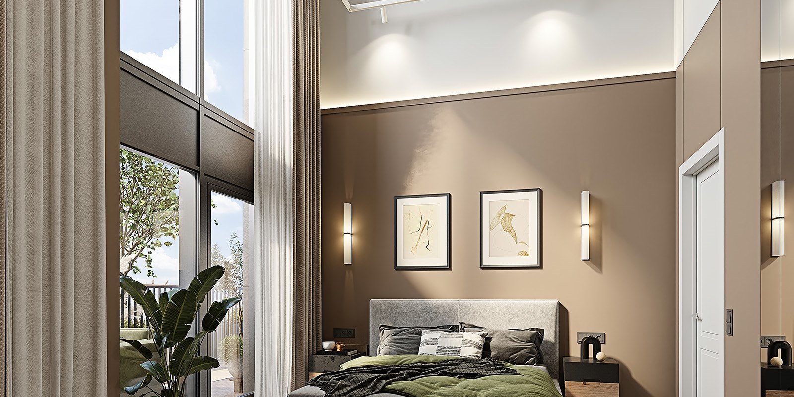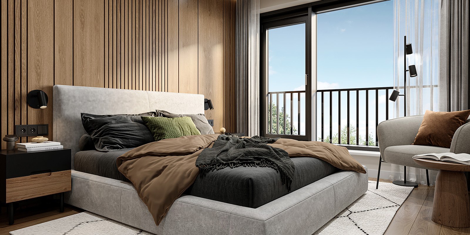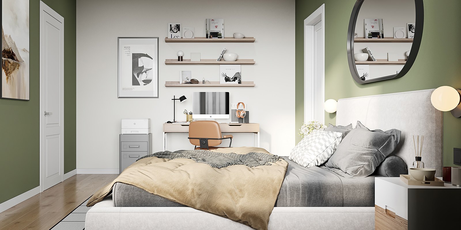 Главное отличие мастер-спальни — многофункциональность и эргономичность. Благодаря отдельным ванной и гардеробной утром удобно собираться на работу. И никакого лишнего шума.