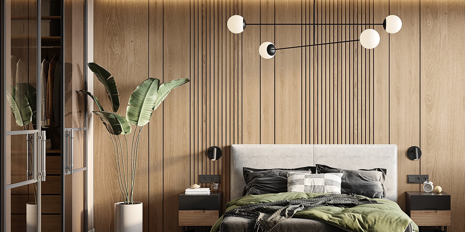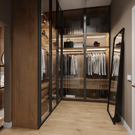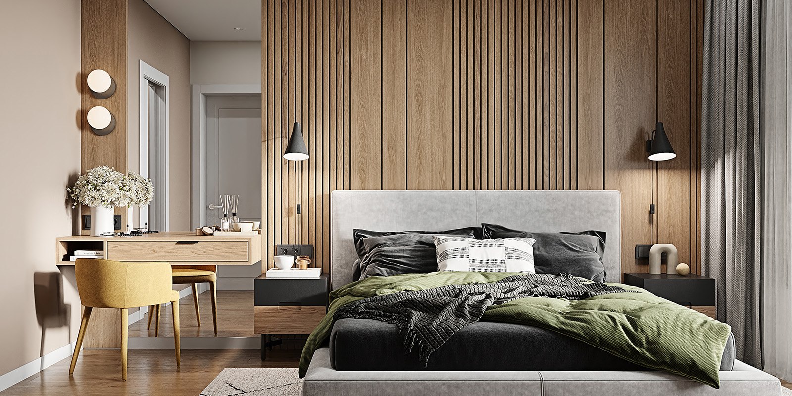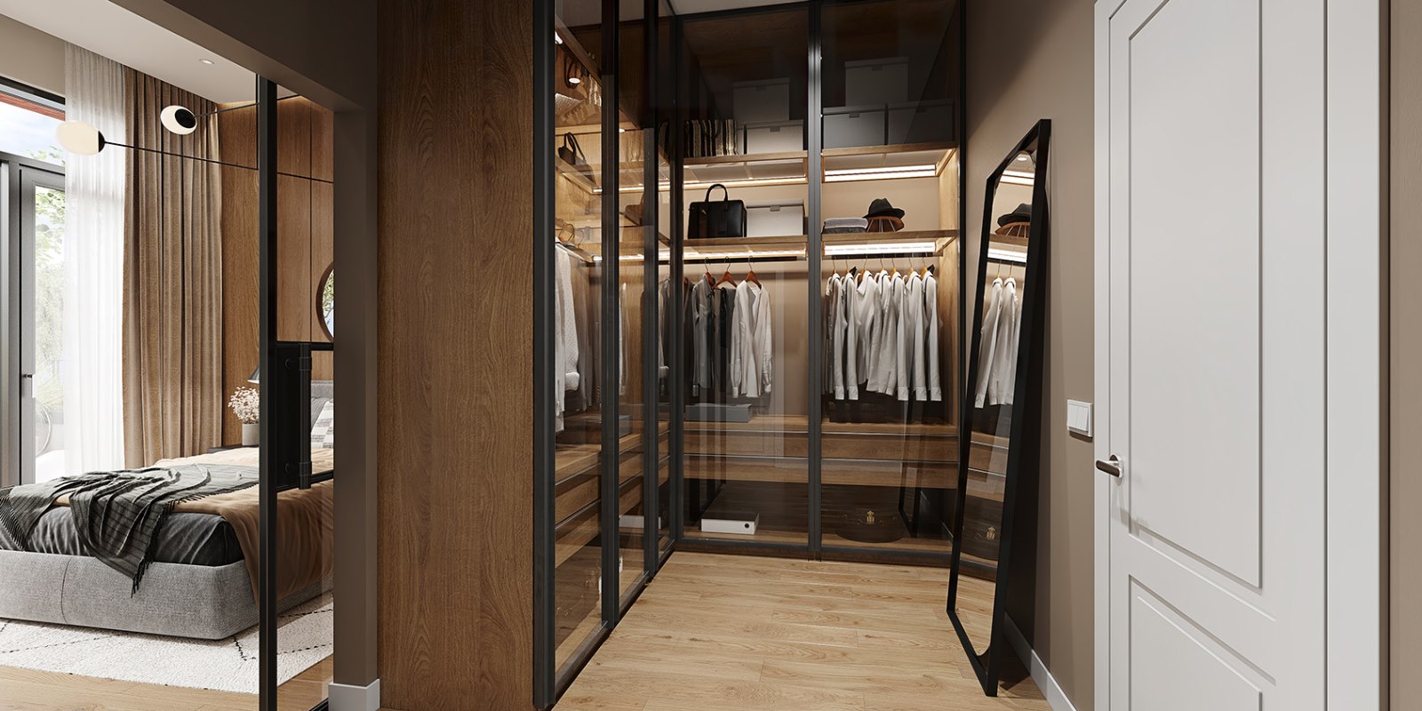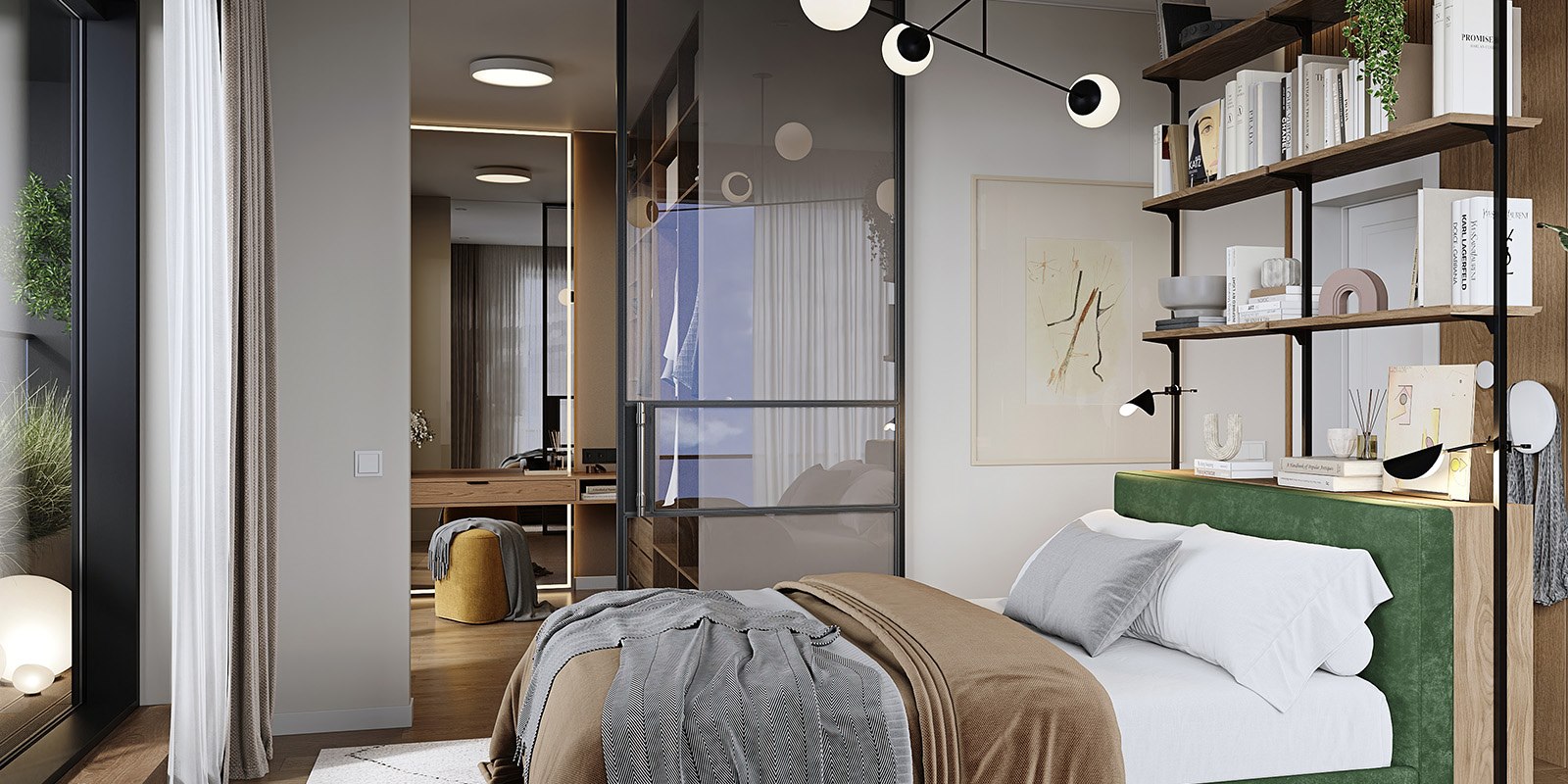Главное отличие мастер-спальни — многофункциональность и эргономичность. Благодаря отдельным ванной и гардеробной утром удобно собираться на работу. И никакого лишнего шума.