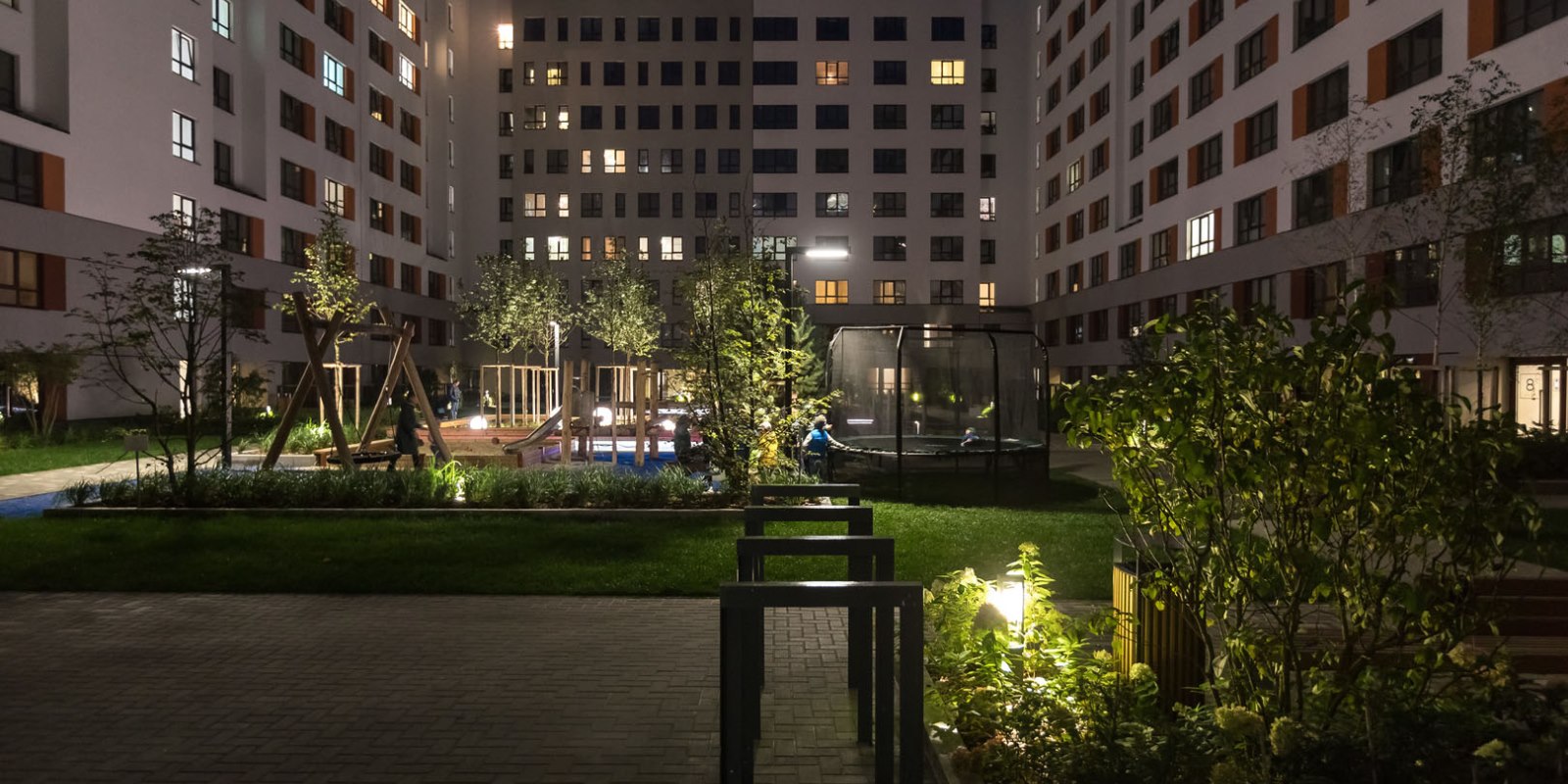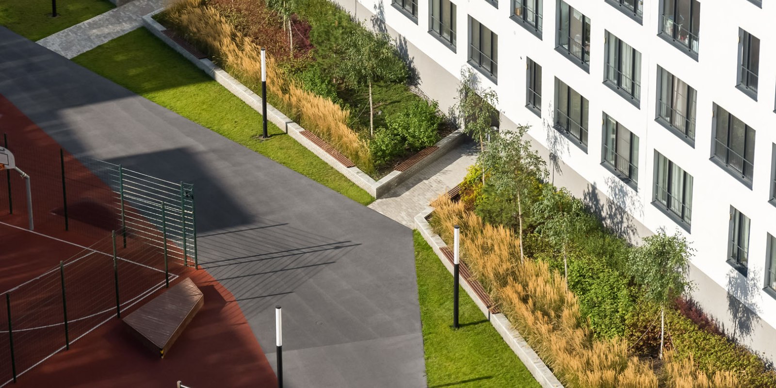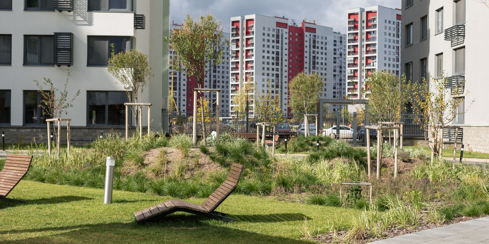 70% территории дворов занимают растения. Мы понимаем, что у пользователей внутреннего пространства дома могут быть совершенно разные (подчас противоположные) интересы и стараемся выделить в его границах смысловые зоны — для игр малышей, для подростков, для тихого отдыха взрослых, для занятия спортом. Одну зону от другой обычно отделяют зелеными буферами.