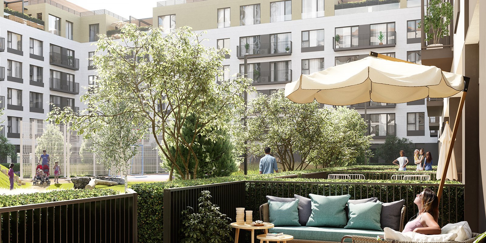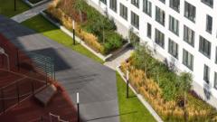 Все дома квартала имеют общий принцип организации дворов: они расположены на крыше паркинга и отгорожены от улицы. Так обеспечивается их камерность и приватность.