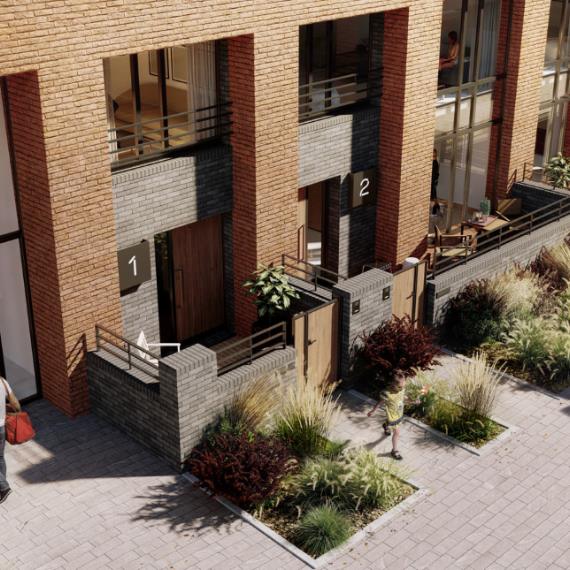 На первых этажах урбан-вилл расположены двухуровневые квартиры с отдельным входом и цокольным этажом. Они воплощают концепцию «дом в доме», где на первом этаже — кухня-гостиная, на втором — приватные спальни, а на цокольном — вспомогательные помещения: постирочная, винный погреб, спортзал. В цоколе сделаны приямки для проникновения естественного света. Отдельный вход повышает приватность проживания и делает жизнь в городе похожей на загородную. Можно попасть домой, не заходя в подъезд. В квартирах с отдельным входом есть тёплый тамбур для сохранения тепла и шумоизоляции от улицы.