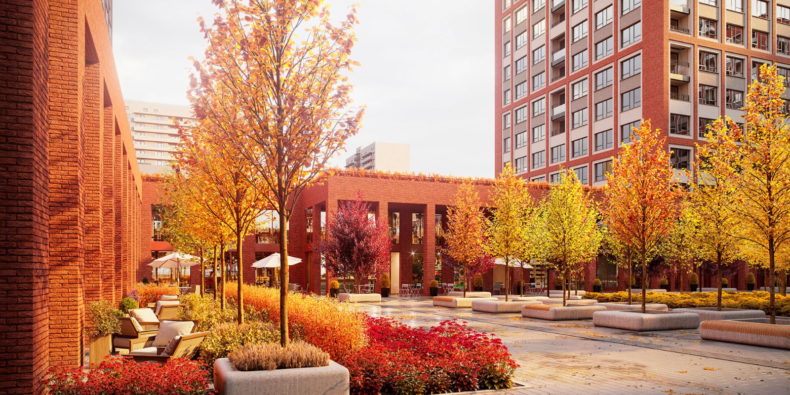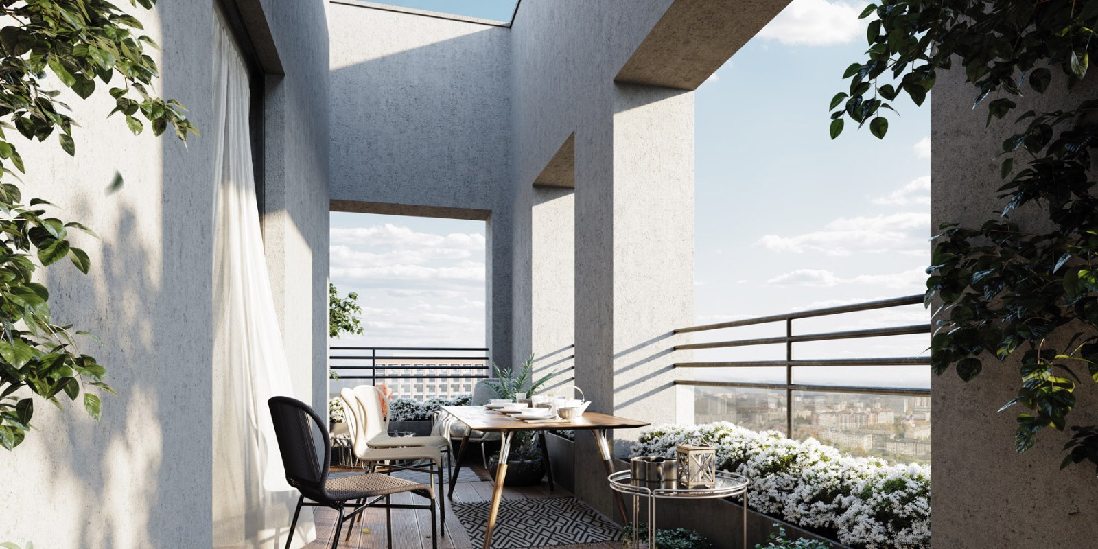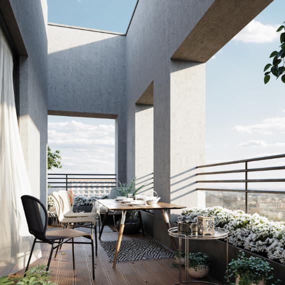 В новом проекте архитекторы предусмотрели террасы трех типов. Первый — прогулочные. Они опоясывают последние этажи самых высоких башен. С них открывается панорамный вид на город. Второй тип — террасы на стилобате. Они примыкают к квартирам на третьих этажах. Их площадь позволяет установить спортивные тренажеры, качели или уличную мебель и в теплое время года использовать это пространство как обеденную зону. Третий тип — террасы на кровле. Квартиры с таким планировочным решением предусмотрены в урбан-виллах.