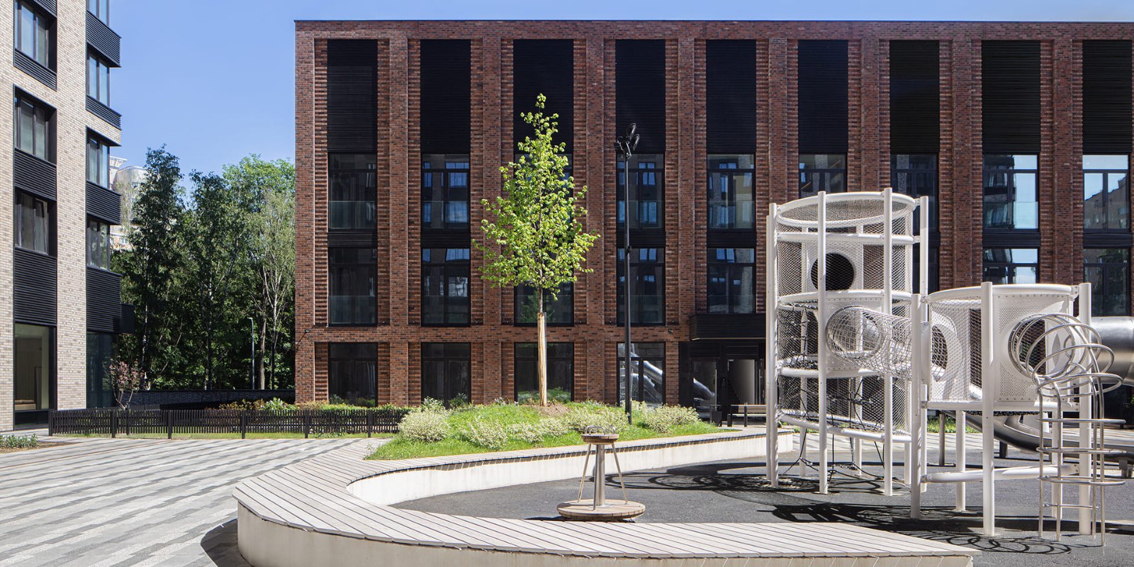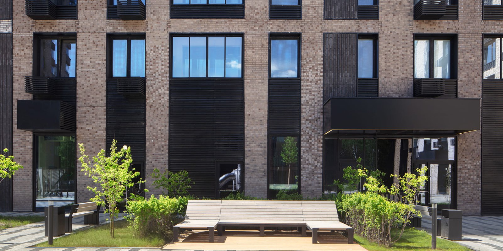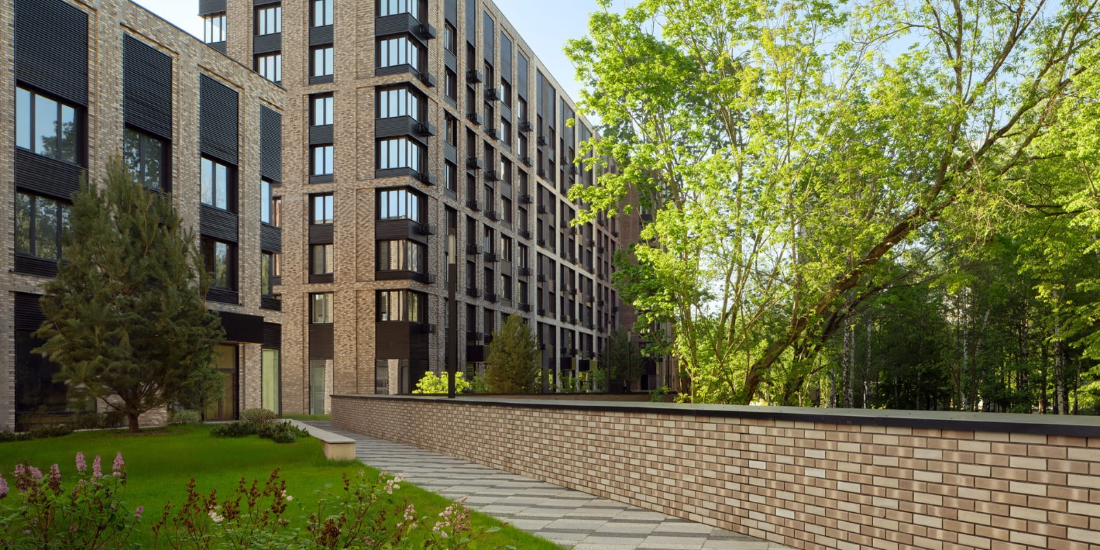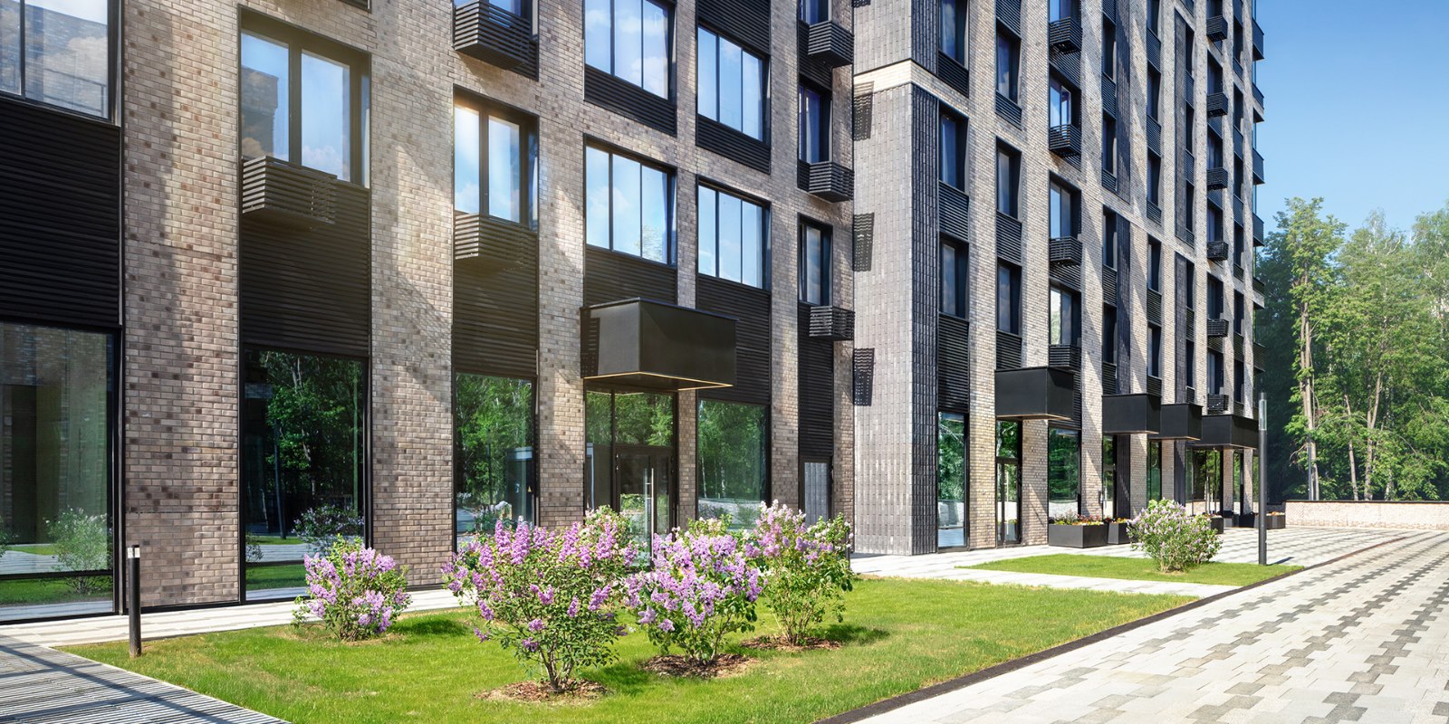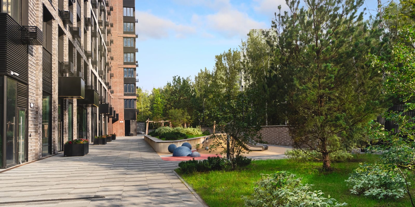 Аккуратно уложенную брусчатку на всей территории комплекса деликатно дополняют островки зеленых клумб, альпийские горки, аккуратно подстриженные декоративные деревья и кусты. Огороженная территория, авторская отделка лобби и эффектные архитектурные формы – безмолвное свидетельство статуса жильцов и безупречного вкуса.