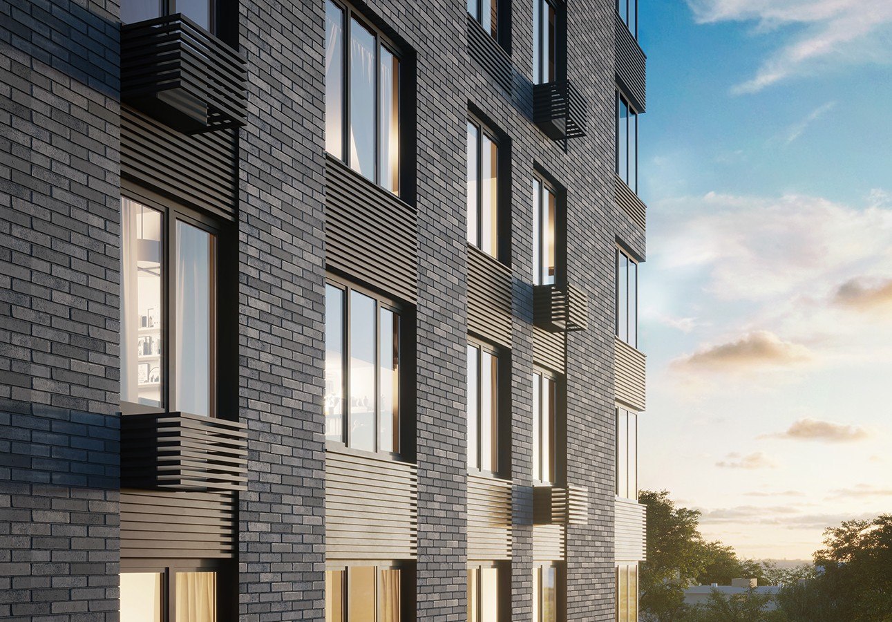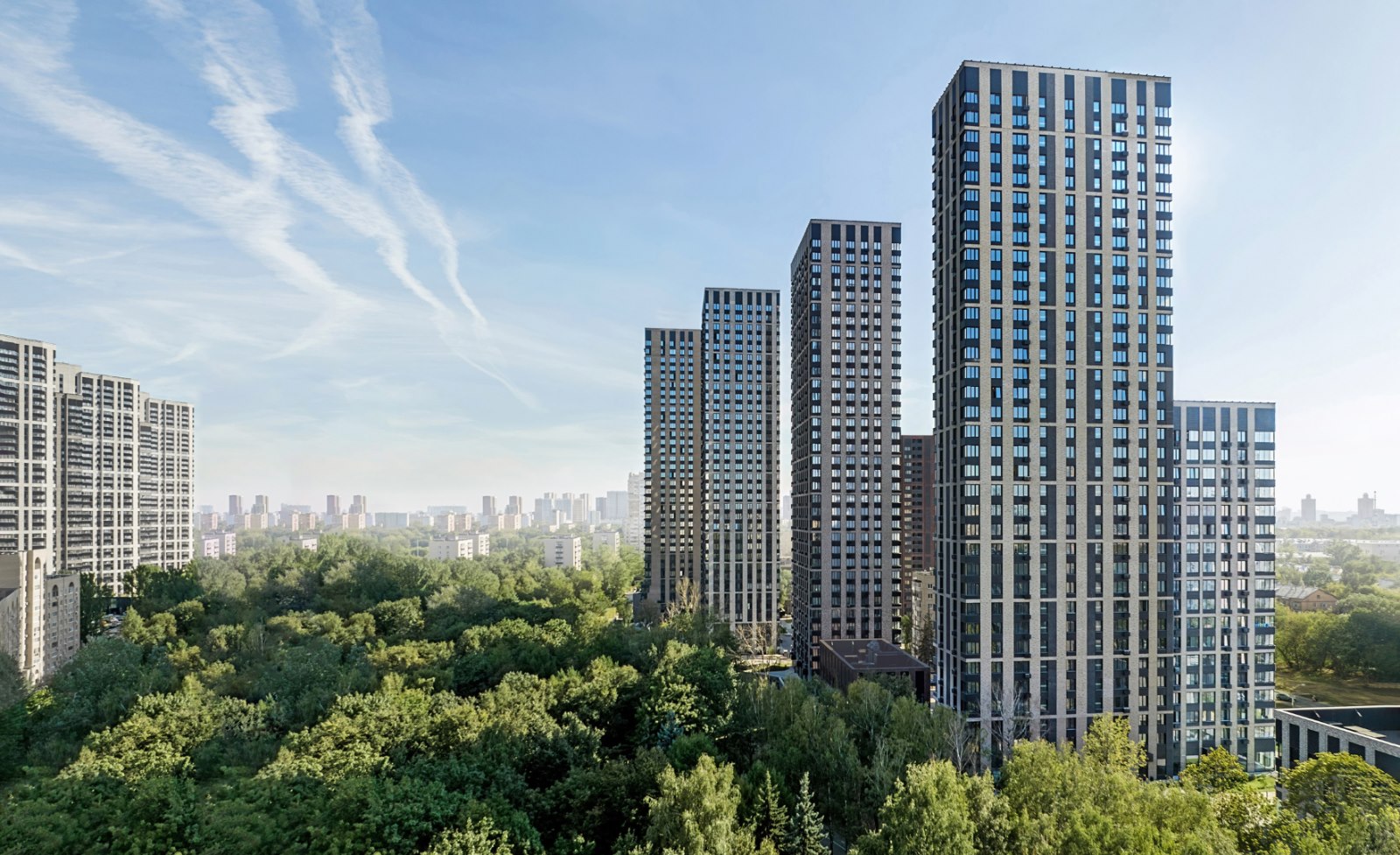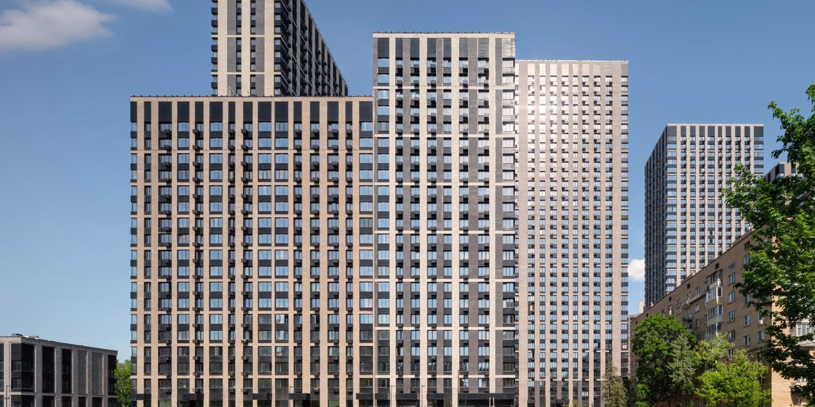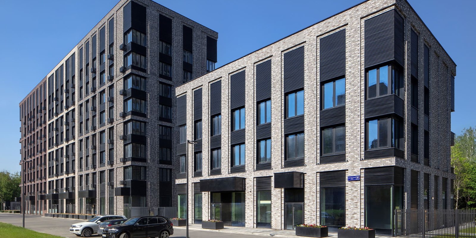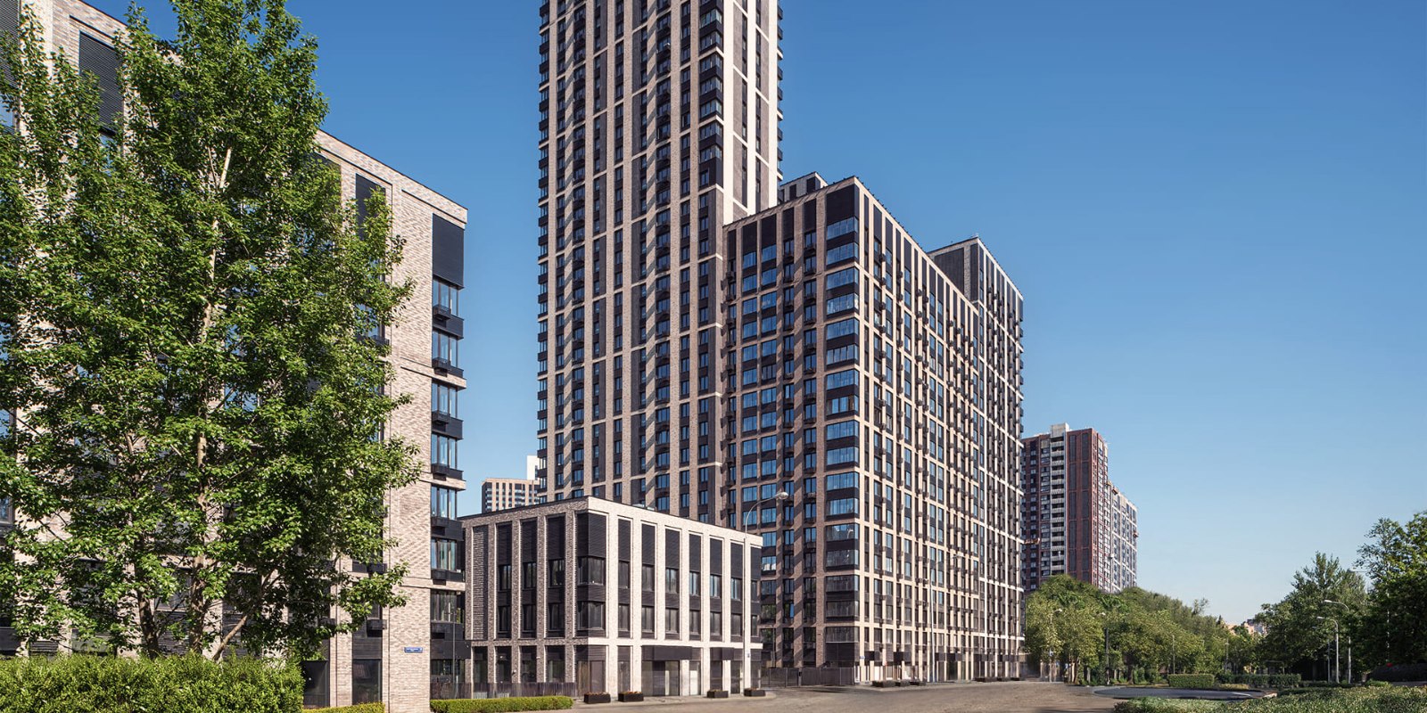 Проект фасадов разработан международным архитектурным бюро СПИЧ. Облицовка фасадов мелкоштучной плиткой гарантирует долговечность и безупречный внешний вид зданий в любое время года. Шоколадно-молочная цветовая палитра формирует уникальный стиль домов бизнес-класса, который мягко выделяет их на фоне окружающих зданий.