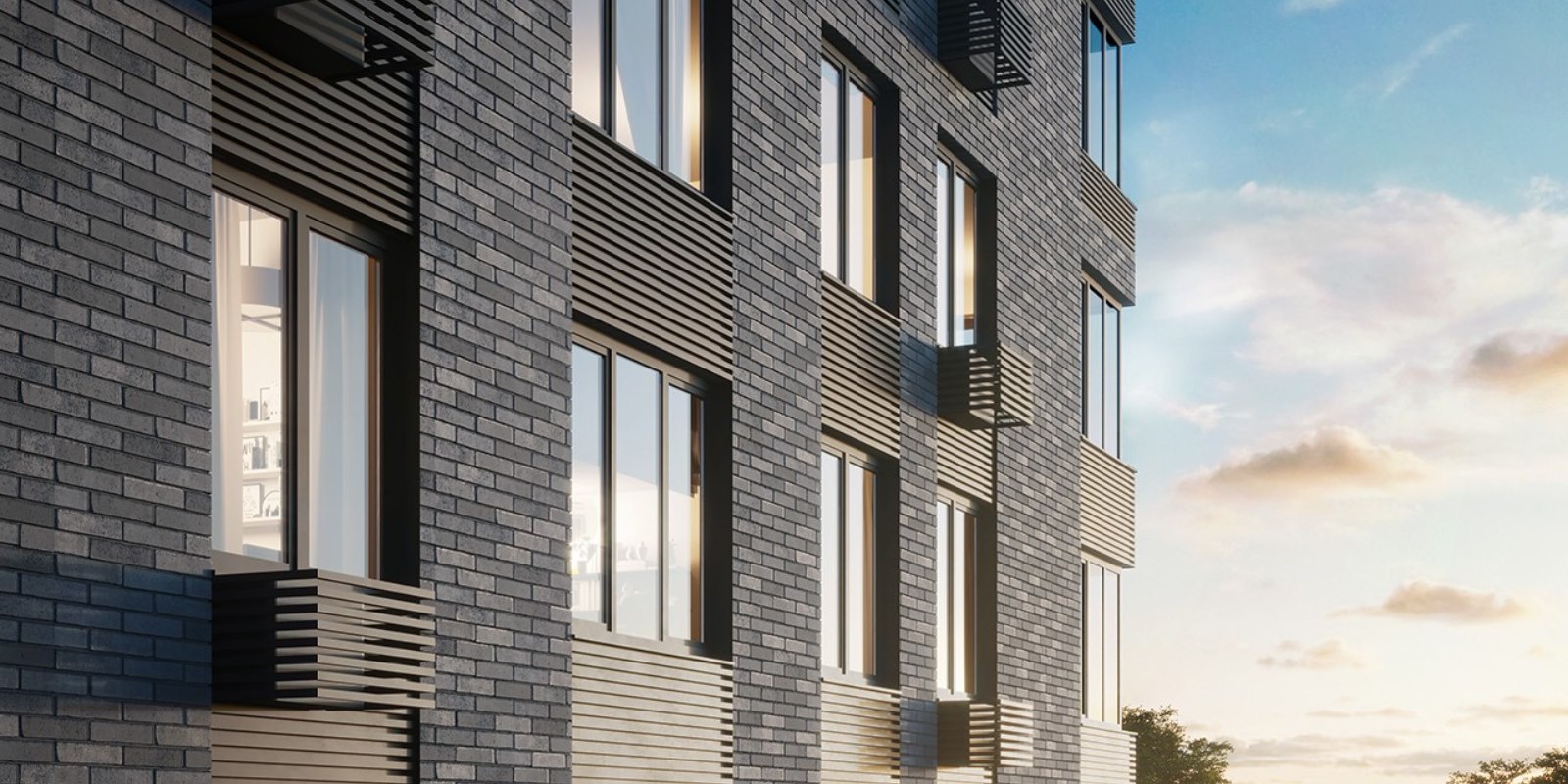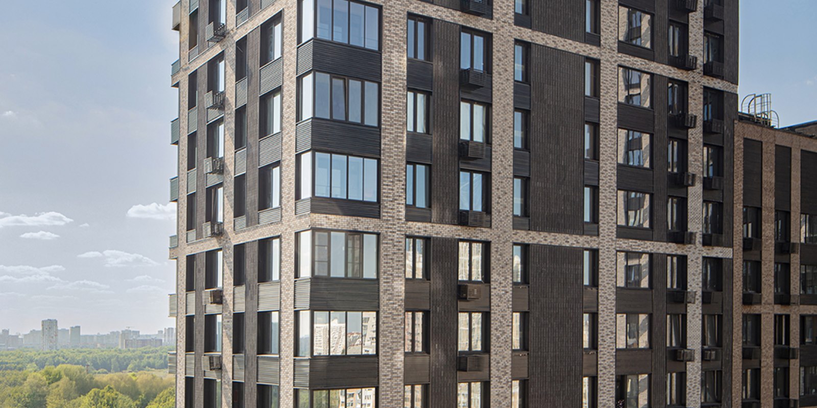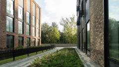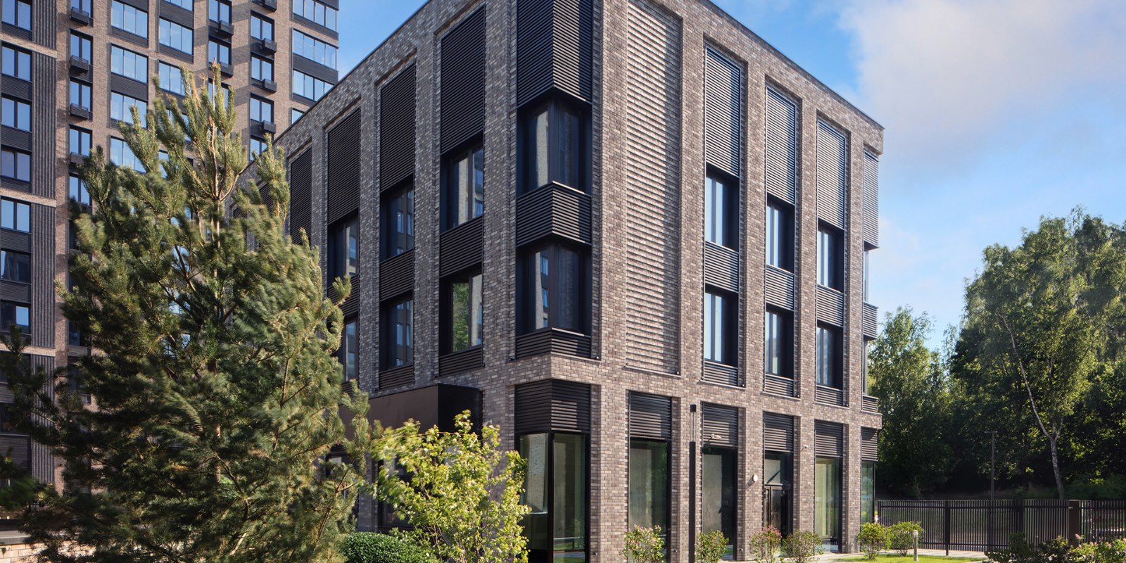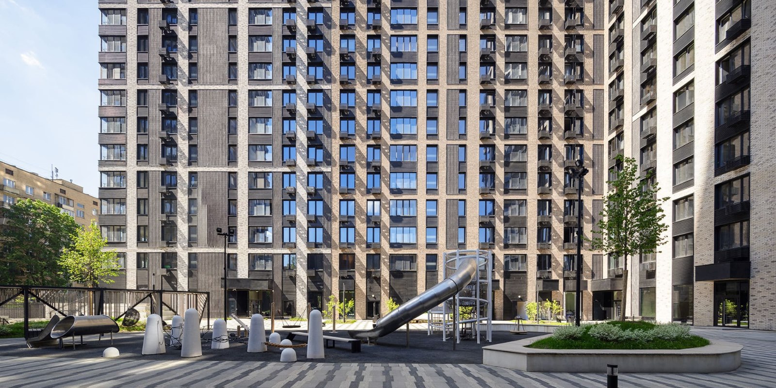 Проект фасадов разработан международным архитектурным бюро СПИЧ. Облицовка фасадов мелкоштучной плиткой гарантирует долговечность и безупречный внешний вид зданий в любое время года. Шоколадно-молочная цветовая палитра формирует уникальный стиль домов бизнес-класса, который мягко выделяет их на фоне окружающих зданий.