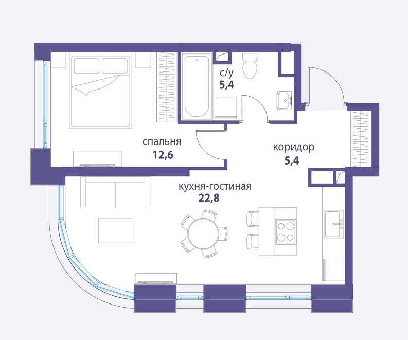 1Комната46.2 M²Общая площадь22.8 M²площадь кухникухня6этаж