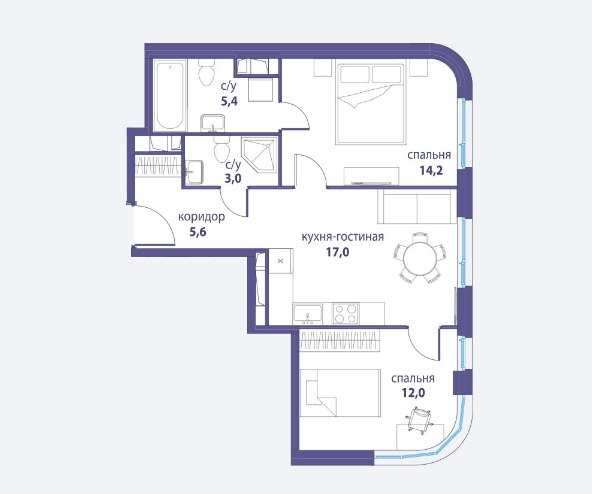 2Комнаты57.2 M²Общая площадь17 M²площадь кухникухня21этаж