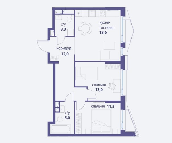 2Комнаты63.4 M²Общая площадь18.6 M²площадь кухникухня7этаж