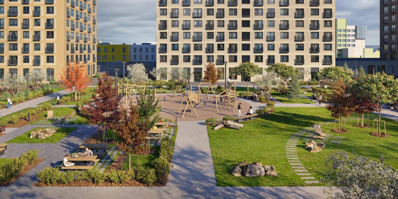 Чтобы провести рабочий день на лужайке рядом с домом, нужно немного — взять ноутбук и выбрать уютное место во дворе-парке. Об остальном мы позаботимся: настроим бесплатный Wi-Fi и установим USB-зарядки в лавочках. А ещё постараемся, чтобы вас никто не отвлекал: двор-парк будет закрыт от машин и случайных прохожих, разделён на зоны для спокойных и активных занятий.