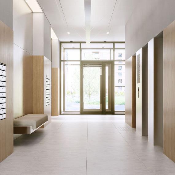 Лобби «Барклая 6» — это просторные и светлые помещения с высокими потолками и панорамным остеклением. В них будет два выхода: на улицу и в уютный двор, оба — на уровне земли. В каждом лобби будет 3–4 лифта, чтобы уменьшить время их ожидания.