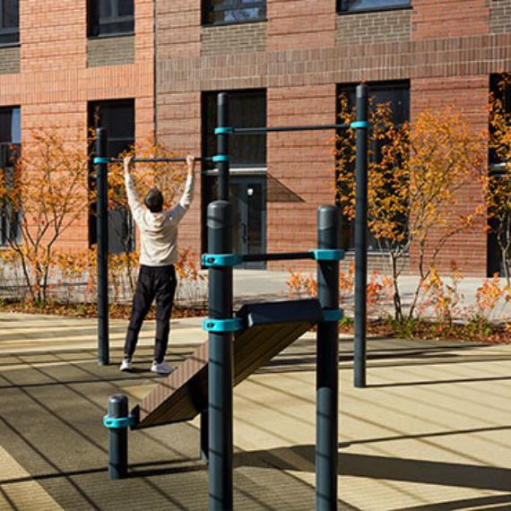 В «Барклая 6» будет площадка для уличных тренировок. Здесь будут установлены турники, брусья, ступени для кроссфита и скамьи для пресса. На площадках не бывает скользко ни после дождя, ни в мороз: покрытие сделано из резиновой крошки.
