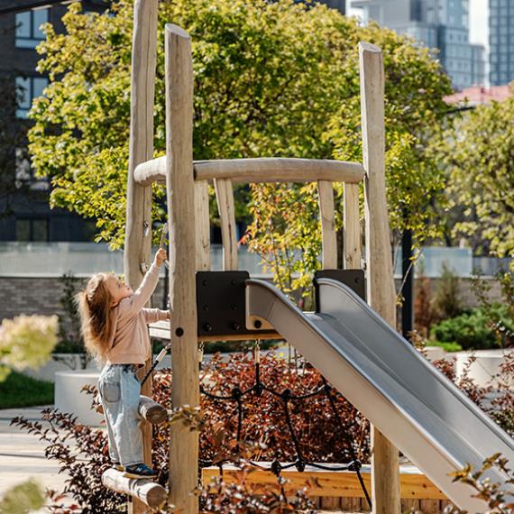 Оборудование наших площадок не похоже на ракеты, корабли и паровозики: у него простые или абстрактные формы — так у детей развивается фантазия: они могут всякий раз придумать новую игру. Скучно здесь не будет детям любого возраста. Натуральные материалы способствуют развитию сенсорных ощущений, а безопасное покрытие защитит ребёнка от травм во время игры.