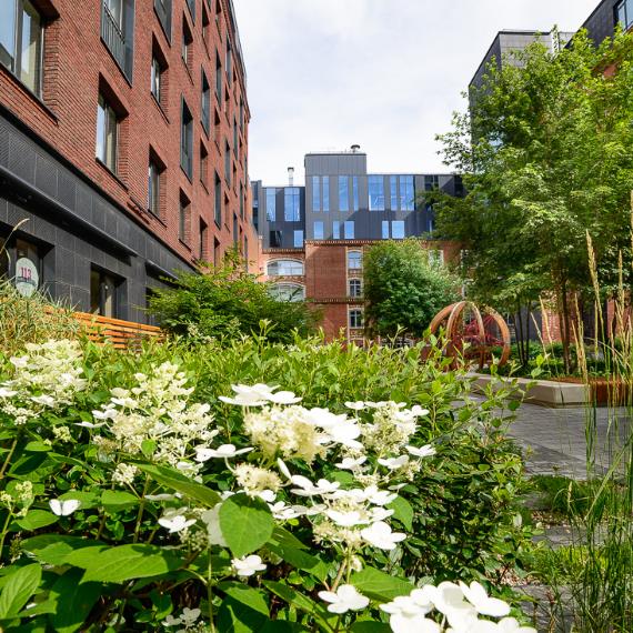 На территории комплекса расположен первый в России музей русского импрессионизма. Ландшафтное озеленение во внутреннем дворе выполнила компания Udo Dagenbach. Созданы уютные оазисы со скамейками, декоративными растениями и прогулочными местами. Для занятий спортом оборудовали спорткомплекс на 1 га, футбольное поле, теннисные корты и поле для игры в сквош. Для детей построили игровую площадку. Машину можно поставить в подземном паркинге.