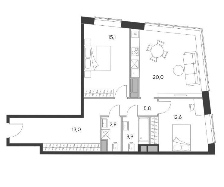 2Комнаты73.3 M²Общая площадь20 M²площадь кухникухня6этаж