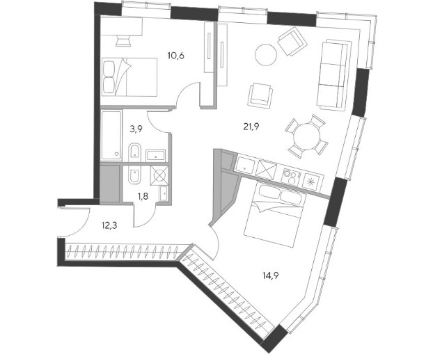 2Комнаты65.4 M²Общая площадь21.9 M²площадь кухникухня15этаж