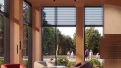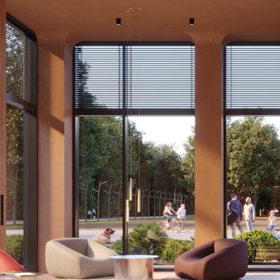 При создании внутренних общественных пространств команда проекта вдохновлялась природой. Использование округлых арок, элементов, напоминающих горные породы, бионические природные формы и металлические поверхности создают уникальный облик общественных пространств комплекса, который эффектно перекликается с его выразительными фасадами. В просторных лобби с высокими потолками 4,7 м и панорамными окнами предусмотрены игровые для детей, мягкие зоны ожидания, ресепшен, комнаты матери и ребенка, места для хранения колясок и велосипедов и гостевые санузлы.